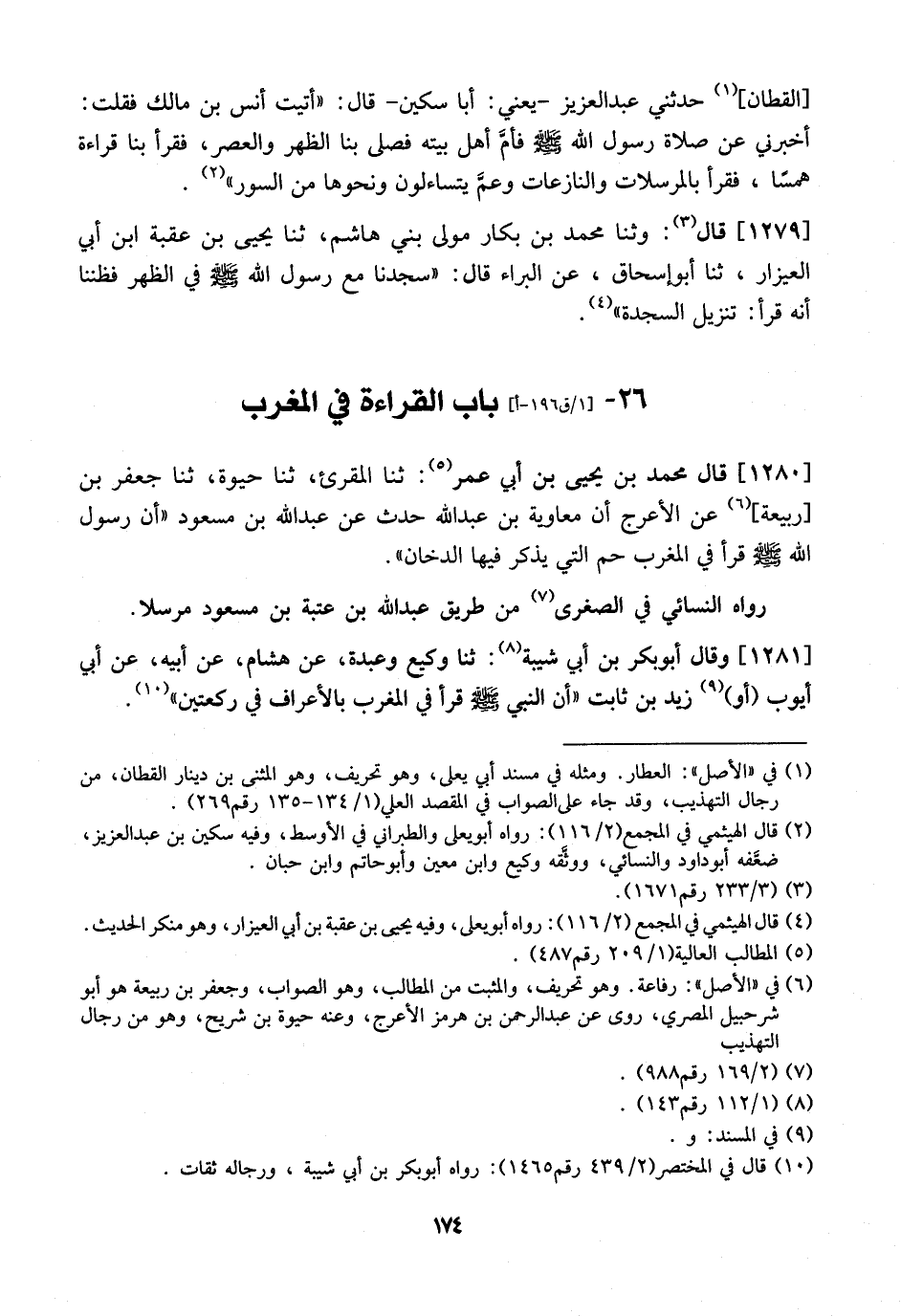 1281 - وَقَالَ أَبُو بَكْرِ بْنُ أَبِي شَيْبَةَ: ثنا وَكِيعٌ وَعَبْدَةُ، عَنْ هِشَامٍ، عَنْ أَبِيهِ، عَنْ أبي أيوب أوزيد بن ثابت أن النبي - صلى الله عليه وَسَلَّمَ - قَرَأَ فِي الْمَغْرِبِ بِالْأَعْرَافِ فِي رَكْعَتَيْنِ ".