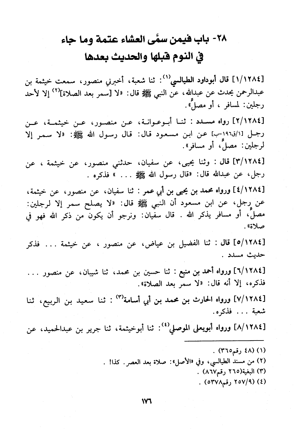 1284 / 1 - قَالَ أَبُو دَاوُدَ الطَّيَالِسِيُّ: ثَنَا شُعْبَةُ، أَخْبَرَنِي مَنْصُورٌ، سَمِعْتُ خَيْثَمَةَ بْنَ عَبْدِ الرَّحْمَنِ يُحَدِّثُ عَنْ عَبْدِ اللَّهِ، عَنِ النَّبِيِّ - صَلَّى اللَّهُ عَلَيْهِ وَسَلَّمَ - قَالَ: "لا سمر بعد الصلاة إِلَّا لِأَحَدِ رَجُلَيْنِ: لِمُسَافِرٍ، أَوْ مصلٍّ ".