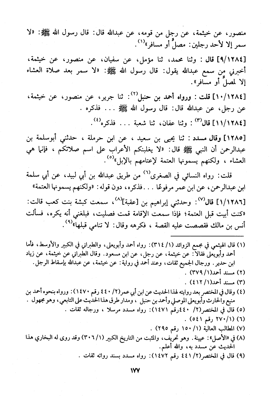1284 / 9 - قَالَ: وثنا مُحَمَّدٌ، ثَنَا مُؤَمَّلٌ، عَنْ سُفْيَانَ، عَنْ مَنْصُورٍ، عَنْ خَيْثَمَةَ، أَخْبَرَنِي مَنْ سَمِعَ عَبْدَ اللَّهِ يَقُولُ: قَالَ رَسُولُ اللَّهِ - صَلَّى اللَّهُ عَلَيْهِ وسلم -: (الا سَمَرَ بَعْدَ صَلَاةِ الْعِشَاءِ إِلَّا لمصلٍّ أَوْ مُسَافِرٍ".