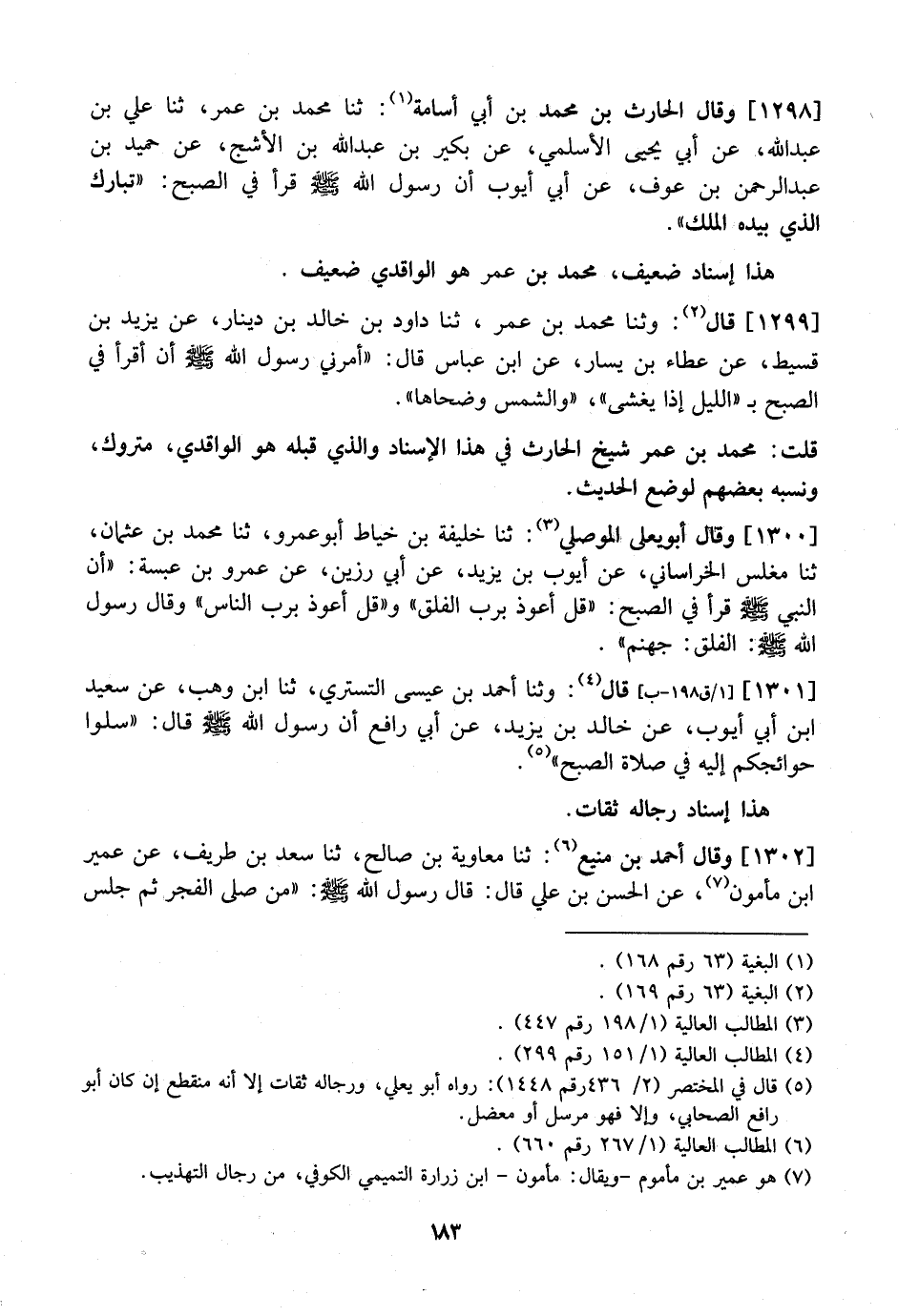 1298 - وَقَالَ الْحَارِثُ بْنُ مُحَمَّدِ بْنِ أَبِي أُسَامَةَ: ثَنَا مُحَمَّدُ بْنُ عُمَرَ، ثَنَا عَلِيُّ بْنُ عبد الله، عن أَبِي يَحْيَى الْأَسْلَمِيُّ، عَنْ بُكَيْرِ بْنِ عَبْدِ اللَّهِ بْنِ الْأَشَجِّ، عَنْ حُمَيْدِ بْنِ عَبْدِ الرَّحْمَنِ بْنِ عَوْفٍ، عَنْ أَبِي أَيُّوبَ أَنَّ رَسُولَ اللَّهِ - صَلَّى اللَّهُ عَلَيْهِ وَسَلَّمَ - قَرَأَ فِي الصُّبْحِ: "تَبَارَكَ الَّذِي بِيَدِهِ الْمُلْكُ ".