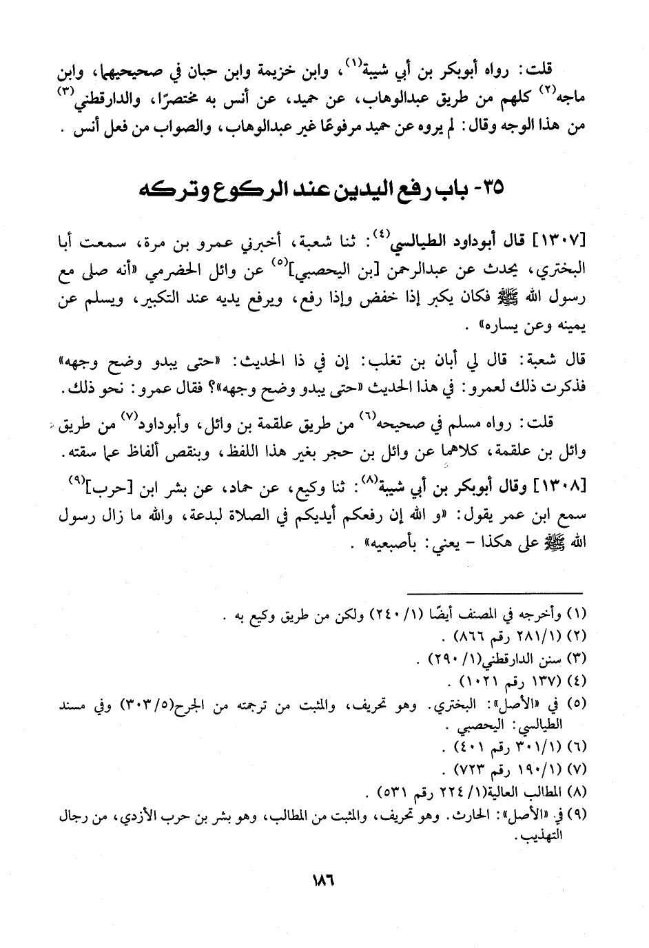 1308 - وَقَالَ أَبُو بَكْرِ بْنُ أَبِي شَيْبَةَ: ثَنَا وَكِيعٌ، عَنْ حَمَّادٍ، عَنْ بشر ابن حرب سمع ابن عمر يقول: "والله إِنَّ رَفْعَكُمْ أَيْدِيَكُمْ فِي الصَّلَاةِ لَبِدْعَةٌ، وَاللَّهِ مَا زَالَ رَسُولُ اللَّهِ - صَلَّى اللَّهُ عَلَيْهِ وَسَلَّمَ - على هكذا- يعني: بأصبعيه ".
