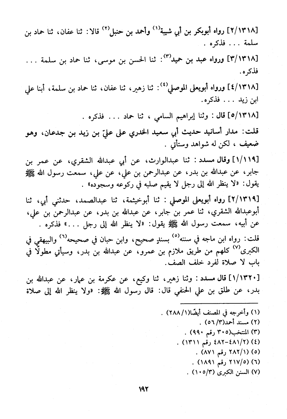 1319 / 2 - رَوَاهُ أَبُو يَعْلَى الْمُوصِلِيُّ: ثنا أَبُو خَيْثَمَةَ، ثَنَا عَبْدُ الصَّمَدِ، حَدَّثَنِي أَبِي، ثَنَا أَبُو عَبْدِ اللَّهِ الشَّقَرِيُّ، ثَنَا عُمَرُ بْنُ جَابِرٍ، عَنْ عَبْدِ اللَّهِ بْنِ بَدْرٍ، عَنْ عَبْدِ الرَّحْمَنِ بْنِ عَلِيٍّ، عَنْ أَبِيهِ، سَمِعْتُ رَسُولَ اللَّهِ - صَلَّى اللَّهُ عَلَيْهِ وَسَلَّمَ - يَقُولُ: "لَا يَنْظُرُ اللَّهُ إِلَى رَجُلٍ ... " فَذَكَرَهُ. قُلْتُ: رَوَاهُ ابْنُ مَاجَهْ فِي سُنَنِهِ بسندٍ صَحِيحٍ، وَابْنُ حِبَّانَ فِي صَحِيحِهِ وَالْبَيْهَقِيُّ فِي الْكُبْرَى كُلُّهُمْ مِنْ طَرِيقِ مُلَازِمِ بْنِ عَمْرٍو، عَنْ عَبْدِ اللَّهِ بْنِ بَدْرٍ، وَسَيَأْتِي مُطَوَّلًا فِي بَابِ لَا صَلَاةَ لِفَرْدٍ خَلْفَ الصَّفِّ.