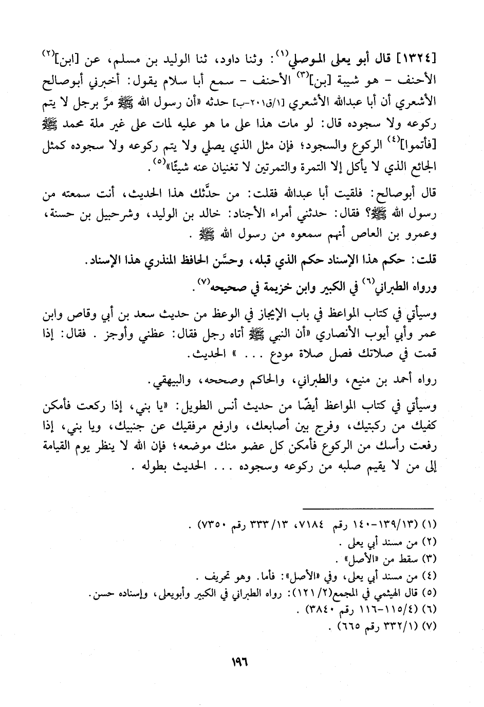 1324 - قَالَ أَبُو يَعْلَى الْمَوْصِلِيُّ: وَثَنَا دَاوُدُ، ثَنَا الْوَلِيدُ بْنُ مُسْلِمٍ، عَنِ ابْنِ الْأَحْنَفِ- هُوَ شَيْبَةُ بْنُ الْأَحْنَفِ- سَمِعَ أَبَا سَلامٍ يَقُولُ: أَخْبَرَنِي أَبُو صَالِحٍ الْأَشْعَرِيُّ أَنَّ أَبَا عَبْدِ اللَّهِ الْأَشْعَرِيَّ حَدَّثَهُ "أَنَّ رَسُولَ اللَّهِ - صَلَّى اللَّهُ عَلَيْهِ وسلم - مرَّ برجل لا رُكُوعَهُ وَلَا سُجُودَهُ قَالَ: لَوْ مَاتَ هَذَا عَلَى مَا هُوَ عَلَيْهِ لَمَاتَ عَلَى غَيْرِ مِلَّةِ مُحَمَّدٍ - صَلَّى اللَّهُ عَلَيْهِ وَسَلَّمَ - فَأَتِّمُوا الرُّكُوعَ وَالسُّجُودَ فَإِنَّ مَثَلَ الَّذِي يُصَلِّي وَلَا يُتِمُّ رُكُوعَهُ وَلَا سُجُودَهُ كَمَثَلِ الْجَائِعِ الَّذِي لا يأكل إلا التمرة والتمرتين لا تغنيان عَنْهُ شَيْئًا".