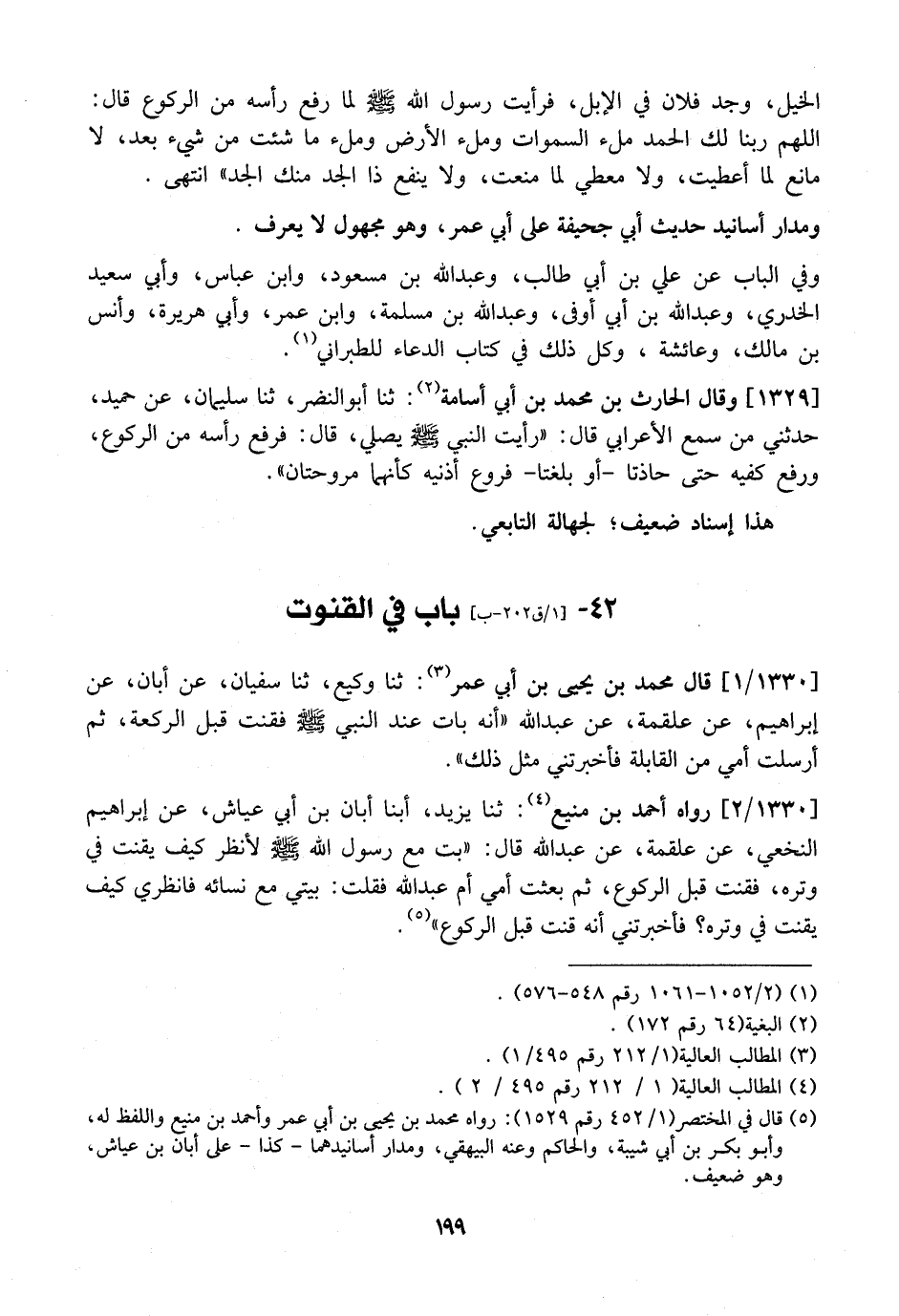 1330 / 2 - رَوَاهُ أَحْمَدُ بْنُ مَنِيعٍ: ثنا يزيد، أبنا أَبَانُ بْنُ أَبِي عَيَّاشٍ، عَنْ إِبْرَاهِيمَ النَّخَعِيِّ، عَنْ عَلْقَمَةَ، عَنْ عَبْدِ اللَّهِ قَالَ: "بِتُّ مَعَ رَسُولِ اللَّهِ - صَلَّى اللَّهُ عَلَيْهِ وَسَلَّمَ - لِأَنْظُرَ كَيْفَ يَقْنُتُ فِي وِتْرِهِ، فَقَنَتَ قَبْلَ الرُّكُوعِ، ثُمَّ بَعَثْتُ أُمِّي أُمَّ عَبْدِ اللَّهِ فَقُلْتُ: بَيِّتِي مَعَ نِسَائِهِ فَانْظُرِي كَيْفَ يَقْنُتُ فِي وِتْرِهِ؟ فَأَخْبَرَتْنِي أَنَّهُ قَنَتَ قَبْلَ الرُّكُوعِ "