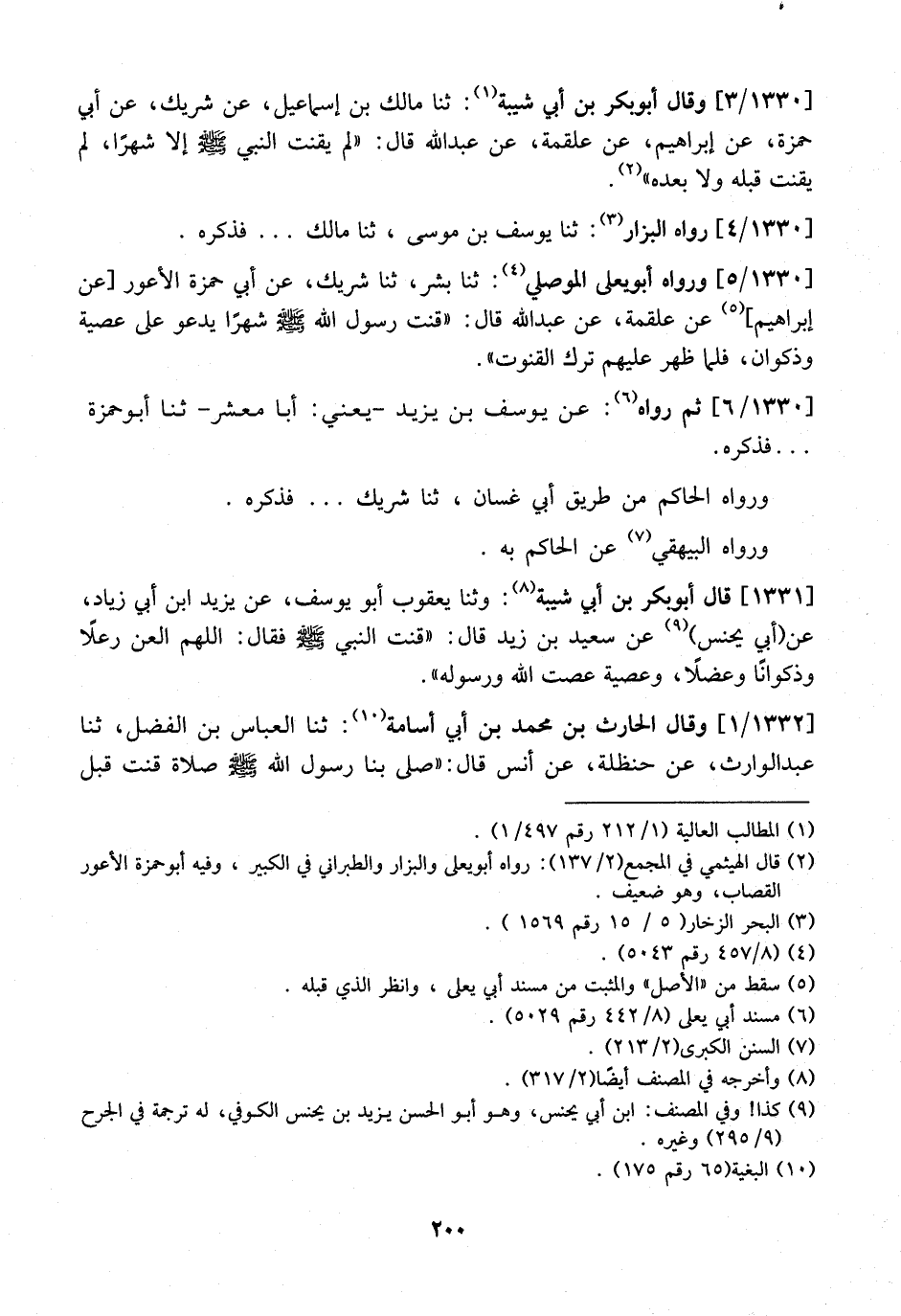 1330 / 3 - وَقَالَ أَبُو بَكْرِ بْنُ أَبِي شَيْبَةَ: ثنا مَالِكُ بْنُ إِسْمَاعِيلَ، عَنْ شَرِيكٍ، عَنْ أَبِي حَمْزَةَ، عَنْ إِبْرَاهِيمَ، عَنْ عَلْقَمَةَ، عَنْ عَبْدِ اللَّهِ قَالَ: "لَمْ يَقْنُتِ النَّبِيُّ - صَلَّى اللَّهُ عَلَيْهِ وَسَلَّمَ - إِلَّا شَهْرًا، لَمْ يَقْنُتْ قَبْلَهُ وَلَا بَعْدَهُ "