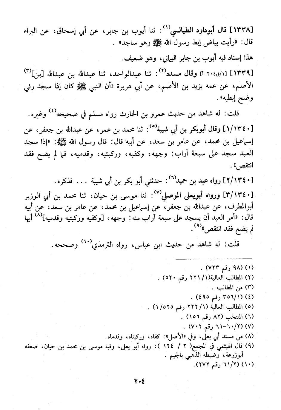 1340 / 3 - وَرَوَاهُ أَبُو يَعْلَى الْمَوْصِلِيُّ: ثنا مُوسَى بْنُ حَيَّانَ، ثنا محمد بن أبي الوزير أبو المطرف، عن عبد الله بن جعفر، عن إسماعيل بن محمد، عَنْ عَامِرِ بْنِ سَعْدٍ، عَنْ أَبِيهِ قَالَ: "أمر العبد أن يسجد على سبعة آراب منه: وجهه، أوكفيه وركبتيه وقدميه أيها لم يضع فقد انتقص ".