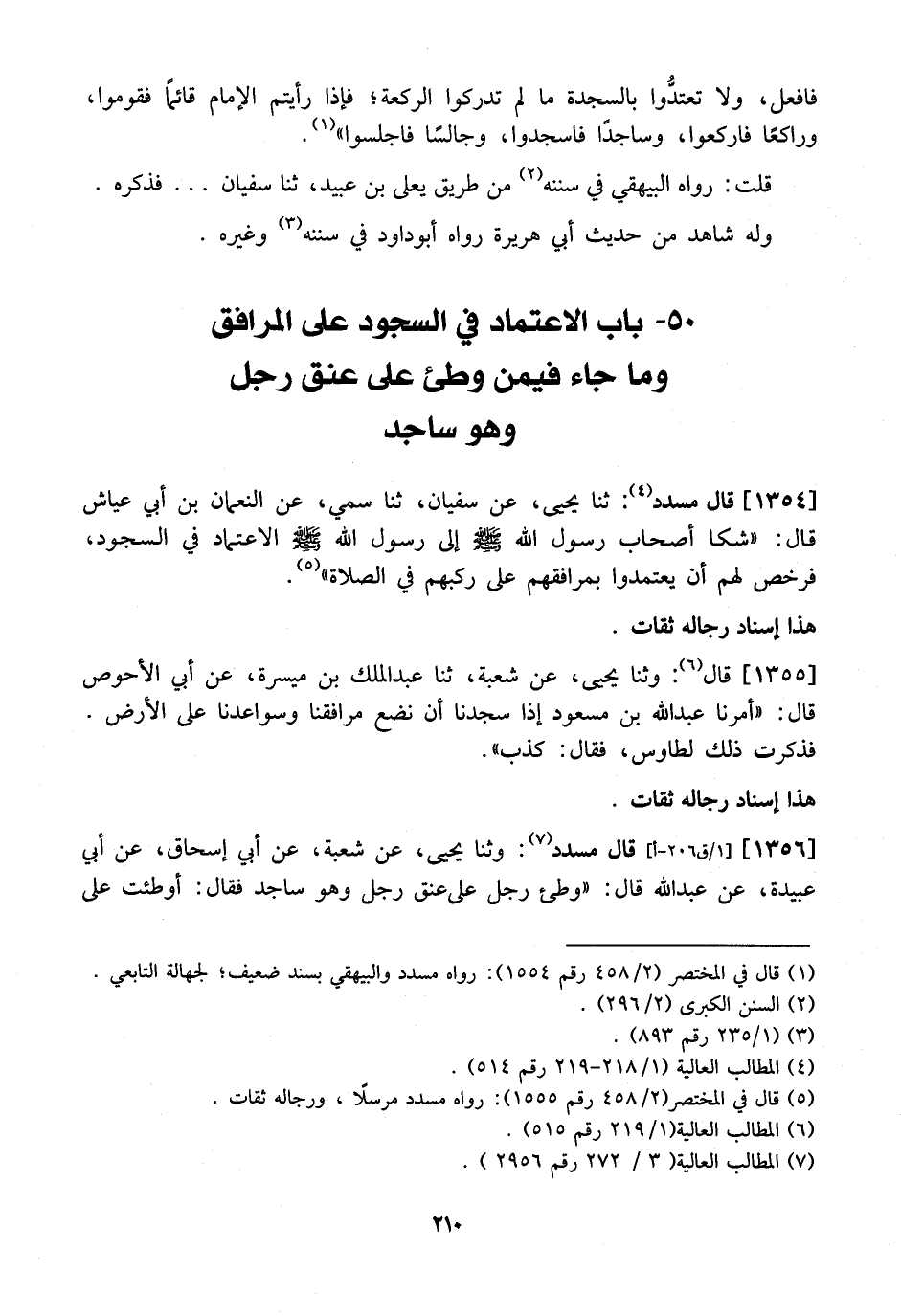 1356 - قَالَ مُسَدَّدٌ: وَثَنَا يَحْيَى، عَنْ شُعْبَةَ، عَنْ أَبِي إِسْحَاقَ، عَنْ أَبِي عُبَيْدَةَ، عَنْ عَبْدِ اللَّهِ قال: "وطىء رَجُلٌ عَلَى عُنُقِ رَجُلٍ وَهُوَ سَاجِدٌ فَقَالَ: أوطئت على
