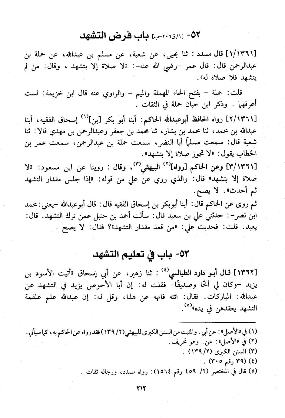 1361 / 1 - قَالَ مُسَدَّدٌ: ثَنَا يَحْيَى، عَنْ شُعْبَةَ، عَنْ مُسْلِمِ بْنِ عَبْدِ اللَّهِ، عَنْ حَمَلَةَ بْنِ عَبْدِ الرَّحْمَنِ قَالَ: قَالَ عُمَرُ- رَضِيَ اللَّهُ عَنْهُ-: "لَا صَلَاةَ إِلَّا بِتَشَهُّدٍ، وَقَالَ: مَنْ لَمْ يَتَشَهَّدْ فَلَا صَلَاةَ لَهُ ".