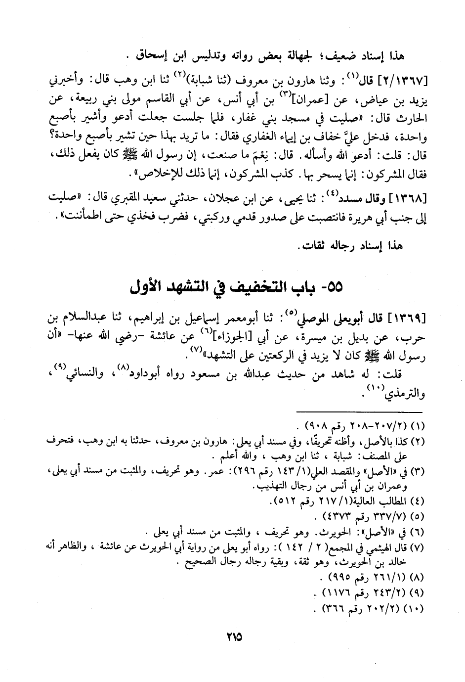 1369 - قَالَ أَبُو يَعْلَى الْمَوْصِلِيُّ: ثَنَا أَبُو مَعْمَرٍ إِسْمَاعِيلُ بْنُ إِبْرَاهِيمَ، ثَنَا عَبْدُ السَّلَامِ بْنُ حَرْبٍ، عَنْ بُدَيْلِ بْنِ مَيْسَرَةَ، عَنْ أبي الجوزاء عَنْ عَائِشَةَ- رَضِيَ اللَّهُ عَنْهَا- "أَنَّ رَسُولَ اللَّهِ - صَلَّى اللَّهُ عَلَيْهِ وَسَلَّمَ - كَانَ لَا يَزِيدُ فِي الرَّكْعَتَيْنِ عَلَى التَّشَهُّدِ".