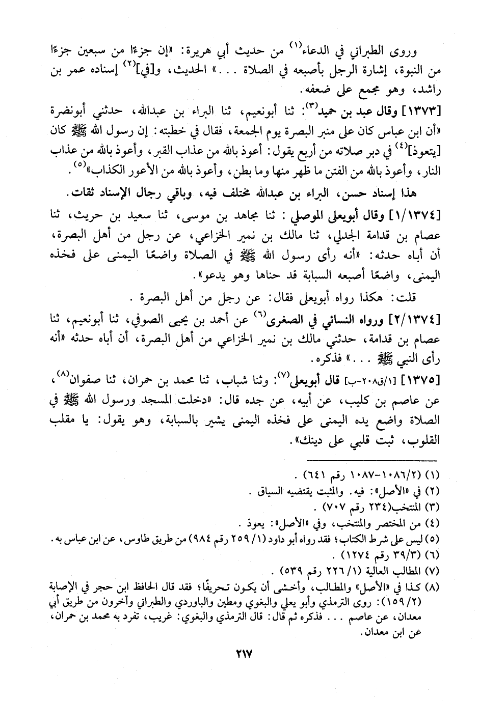 1373 - وَقَالَ عَبْدُ بْنُ حُمَيْدٍ: ثَنَا أَبُو نُعَيْمٍ، ثَنَا البراء بن عبد الله، حدثني أبو نضرة "أَنَّ ابْنَ عَبَاسٍ كَانَ عَلَى مِنْبَرِ الْبَصْرَةِ يَوْمَ الْجُمُعَةِ، فَقَالَ فِي خُطْبَتِهِ: إِنَّ رَسُولَ الله - صلى الله عليه وسلم - كان يتعوذ فِي دُبُرِ صَلَاتِهِ مِنْ أَرْبَعٍ يَقُولُ: أَعُوذُ بِاللَّهِ مِنْ عَذَابِ الْقَبْرِ، وَأَعُوذُ بِاللَّهِ مِنْ عَذَابِ النَّارِ، وَأَعُوذُ بِاللَّهِ مِنَ الْفِتَنِ مَا ظَهَرَ مِنْهَا وَمَا بَطَنَ، وَأَعُوذُ بِاللَّهِ مِنَ الْأَعْوَرِ الْكَذَّابِ ". هَذَا إِسْنَادٌ حَسَنٌ، الْبَرَاءُ بْنُ عَبْدِ اللَّهِ مُخْتَلَفٌ فِيهِ، وَبَاقِي رِجَالِ الْإِسْنَادِ ثِقَاتٌ.