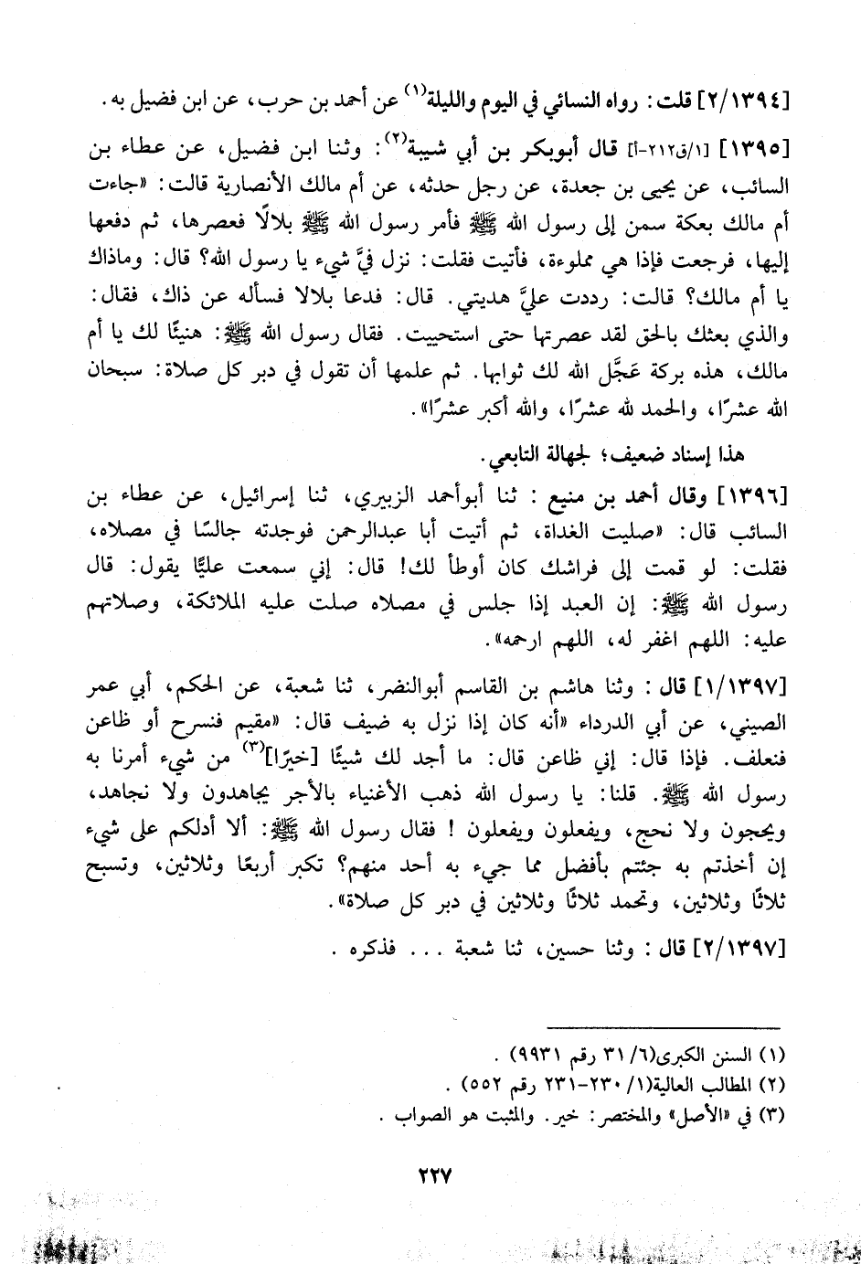 1397 / 1 - قَالَ: وَثَنَا هَاشِمُ بن القاسم أبو النضر، ثنا شعبة، عن الحكم، أَبِي عُمَرَ الصِّينِيِّ، عَنْ أَبِي الدَّرْدَاءِ "أَنَّهُ كان إذا نزل به ضيف قالت: "مُقِيمٌ فَنُسَرِحَ أَوْ ظَاعِنٌ فَنَعْلِفَ. فَإِذَا قَالَ: إِنِّي ظَاعِنٌ قَالَ: مَا أَجِدُ لَكَ شَيْئًا خَيْرًا مِنْ شَيْءٍ أَمَرَنَا بِهِ رَسُولُ اللَّهِ - صَلَّى اللَّهُ عَلَيْهِ وَسَلَّمَ - قُلْنَا: يَا رَسُولَ اللَّهِ ذَهَبَ الْأَغْنِيَاءُ بِالْأَجْرِ يُجَاهِدُونَ وَلَا نُجَاهِدُ، وَيَحُجُّونَ وَلَا نَحِجُّ، وَيَفْعَلُونَ وَيَفْعَلُونَ فَقَالَ رَسُولُ اللَّهِ - صَلَّى اللَّهُ عَلَيْهِ وَسَلَّمَ -: أَلَا أَدُلُكُمْ عَلَى شَيْءٍ إِنْ أَخَذْتُمْ بِهِ جِئْتُمْ بِأَفْضُلَ مما جيء به أحد منهم؟ تكبر أربعًا وثلاثاً وَتُسَبِّحُ ثَلَاثًا وَثَلَاثِينَ، وَتَحْمَدُ ثَلَاثًا وَثَلَاثِينَ فِي دُبُرِ كُلِّ صَلَاةٍ".