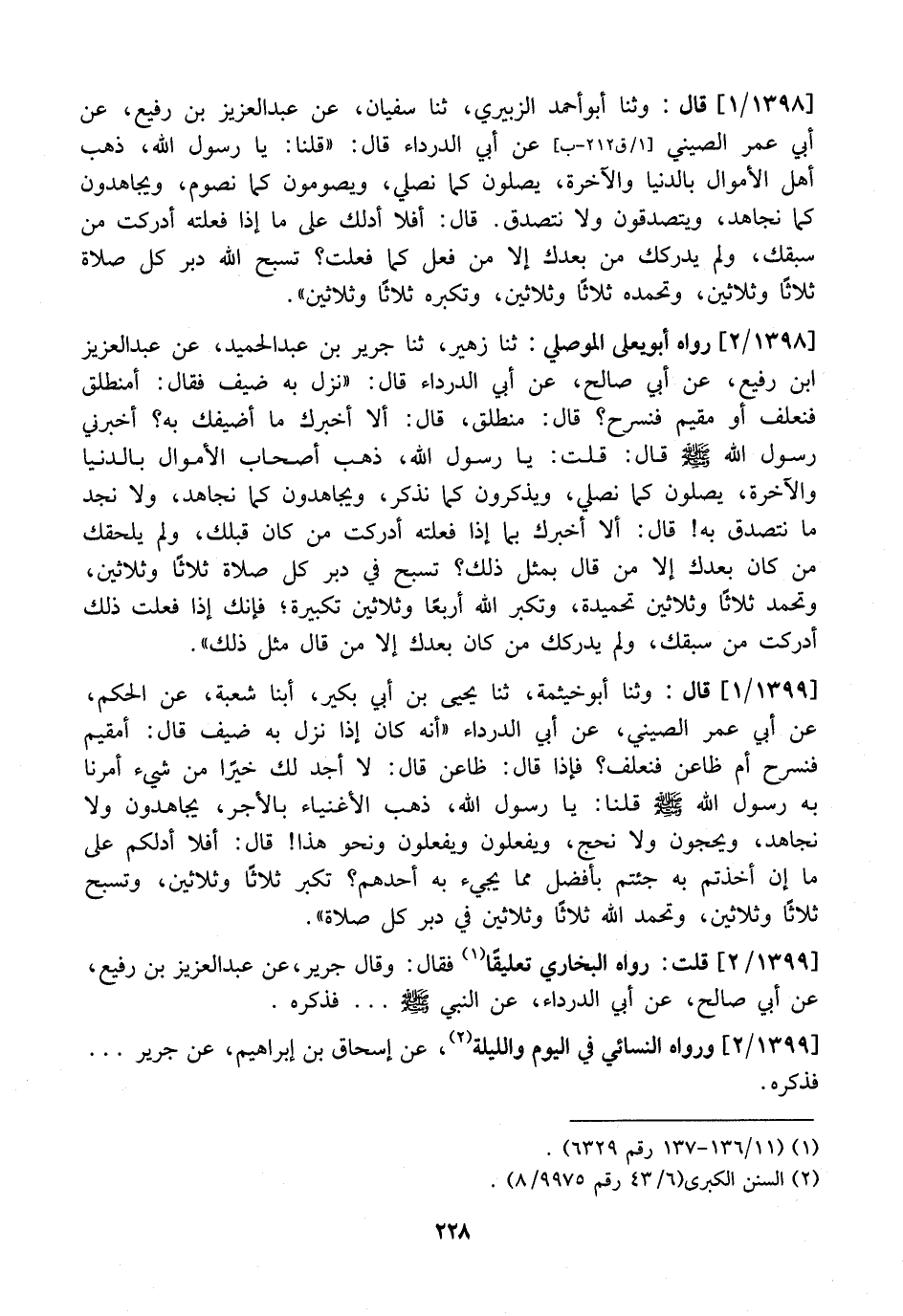 1398 / 2 - رَوَاهُ أَبُو يَعْلَى الْمَوْصِلِيُّ: ثَنَا زُهَيْرٌ، ثَنَا جَرِيرُ بْنُ عَبْدِ الْحَمِيدِ، عَنْ عَبْدِ الْعَزِيزِ بْنِ رَفِيعٍ، عَنْ أَبِي صَالِحٍ، عَنْ أَبِي الدَّرْدَاءِ قَالَ: "نَزَلَ بِهِ ضَيْفٌ فَقَالَ: أَمُنْطَلِقٌ فَنَعْلِفَ أَوْ مُقِيمٌ فَنُسْرِحَ؟ قَالَ: مُنْطَلِقٌ، قَالَ: أَلَا أُخْبِرُكَ مَا أُضَيِّفُكَ بِهِ؟ أَخْبَرَنِي رَسُولُ اللَّهِ - صَلَّى اللَّهُ عَلَيْهِ وَسَلَّمَ - قَالَ: قُلْتُ: يَا رَسُولَ اللَّهِ، ذَهَبَ أَصْحَابُ الْأَمْوَالِ بِالدُّنْيَا وَالْآخِرَةِ، يُصَلُّونَ كَمَا نُصَلِّي، وَيَذْكُرُونَ كَمَا نَذْكُرُ، وَيُجَاهِدُونَ كَمَا نُجَاهِدُ، وَلَا نَجِدُ مَا نَتَصَدَّقُ بِهِ قَالَ: أَلَا أُخْبِرُكَ بِمَا إِذَا فَعَلْتَهُ أَدْرَكْتَ مَنْ كَانَ قَبْلَكَ، وَلَمْ يَلْحَقْكَ مَنْ كَانَ بَعْدَكَ إِلَّا مَنْ قَالَ بِمِثْلِ ذَلِكَ؟ تُسَبِّحُ فِي دُبُرِ كُلِّ صَلَاةٍ ثَلَاثًا وَثَلَاثِينَ، وَتَحْمَدُ ثَلَاثًا وَثَلَاثِينَ تَحْمِيدَةً، وَتُكَبِّرُ اللَّهَ أَرْبَعًا وَثَلَاثِينَ تَكْبِيرَةً، فَإِنَّكَ إِذَا فَعَلْتَ ذَلِكَ أَدْرَكْتَ مَنْ سَبَقَكَ، وَلَمْ يُدْرِكْكَ مَنْ كَانَ بَعْدَكَ إِلَّا مَنْ قَالَ مِثْلَ ذَلِكَ ".