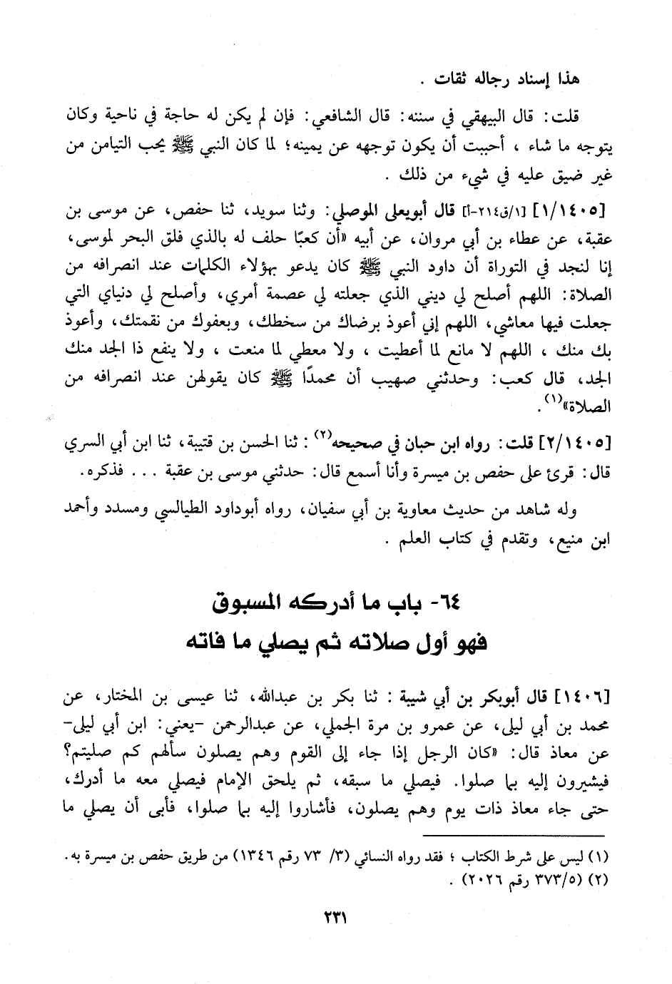 1405 / 2 - قُلْتُ: رَوَاهُ ابْنُ حِبَّانَ فِي صَحِيحِهِ: ثَنَا الْحَسَنُ بْنُ قُتَيْبَةَ، ثَنَا ابْنُ أَبِي المسري قَالَ: قُرِئَ عَلَى حَفْصِ بْنِ مَيْسَرَةَ وَأَنَا أَسْمَعُ قَالَ: حَدَّثَنِي مُوسَى بْنُ عُقْبَةَ ... فَذَكَرَهُ. وَلَهُ شَاهِدٌ مِنْ حَدِيثِ مُعَاوِيَةَ بْنِ أَبِي سفيان، رَوَاهُ أَبُو دَاوُدَ الطَّيَالِسِيُّ وَمُسَدَّدٌ وَأَحْمَدُ بْنُ مَنِيعٍ، وَتَقَدَّمَ فِي كِتَابِ الْعِلْمِ.