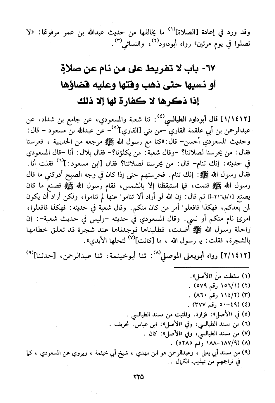 1412 / 1 - قَالَ أَبُو دَاوُدَ الطَّيَالِسِيُّ: ثَنَا شُعْبَةُ وَالْمَسْعُودِيُّ، عَنْ جَامِعِ بْنِ شَدَّادٍ، عَنْ عَبْدِ الرَّحْمَنِ بْنِ أَبِي علقمة القاري- من بني القاري عَنْ عَبْدِ اللَّهِ بْنُ مَسْعُودٍ قَالَ: وَحَدِيثُ الْمَسْعُودِيِّ أَحْسَنُ- قَالَ: "كُنَّا مَعَ رَسُولِ اللَّهِ - صَلَّى اللَّهُ عَلَيْهِ وَسَلَّمَ - مَرْجِعَهُ مِنَ الْحُدَيْبِيَّةِ، فَعَرَّسْنَا فَقَالَ: مَنْ يَحْرُسُنَا لِصَلَاتِنَا؟ - وَقَالَ شُعْبَةُ: مَنْ يَكْلُؤُنَا؟ - فَقَالَ بِلَالٌ: أَنَا- قَالَ الْمَسْعُودِيُّ في حديثه: إنك تنام- قَالَ: مَنْ يَحْرُسُنَا لِصَلَاتِنَا؟ فَقَالَ ابْنُ مَسْعُودٍ:، فَقُلْتُ أَنَا. فَقَالَ رَسُولُ اللَّهِ - صَلَّى اللَّهُ عَلَيْهِ وَسَلَّمَ -: إنك تنام. فَحَرَسْتُهُمْ حَتَّى إِذَا كَانَ فِي وَجْهِ الصُّبْحِ أَدْرَكَنِي مَا قَالَ رَسُولُ اللَّهِ - صَلَّى اللَّهُ عَلَيْهِ وسلم - فنمت، فَمَا اسْتَيْقَظَنَا إِلَّا بِالشَّمْسِ، فَقَامَ رَسُولُ اللَّهِ - صَلَّى اللَّهُ عَلَيْهِ وَسَلَّمَ - فَصَنَعَ مَا كَانَ يَصْنَعُ ثُمَّ قَالَ: إِنَّ اللَّهَ لَوْ أَرَادَ ألا تَنَامُوا عَنْهَا لَمْ تَنَامُوا، وَلَكِنْ أَرَادَ أَنْ يكون لمن بَعْدَكُمْ، فَهَكَذَا فَافْعَلُوا أَمْرَ مَنْ كَانَ مِنْكُمْ. وقال شعبة في حديثه: فهكذا فافعلوا، امرئ نَامَ مِنْكُمْ أَوْ نَسِيَ. وَقَالَ الْمَسْعُودِيُّ فِي حَدِيثِهِ- وَلَيْسَ فِي حَدِيثِ شُعْبَةَ-: إِنَّ رَاحِلَةَ رَسُولِ اللَّهِ - صَلَّى اللَّهُ عَلَيْهِ وَسَلَّمَ - أَضَلَّتْ، فَطَلَبْنَاهَا فَوَجَدْنَاهَا عِنْدَ شَجَرَةٍ قَدْ تَعَلَّقَ خِطَامُهَا بالشجرة، فقلت: يَا رَسُولَ اللَّهِ - صَلَّى اللَّهُ عَلَيْهِ وَسَلَّمَ - ما كانت لِتَحُلَّهَا الْأَيْدِي ".