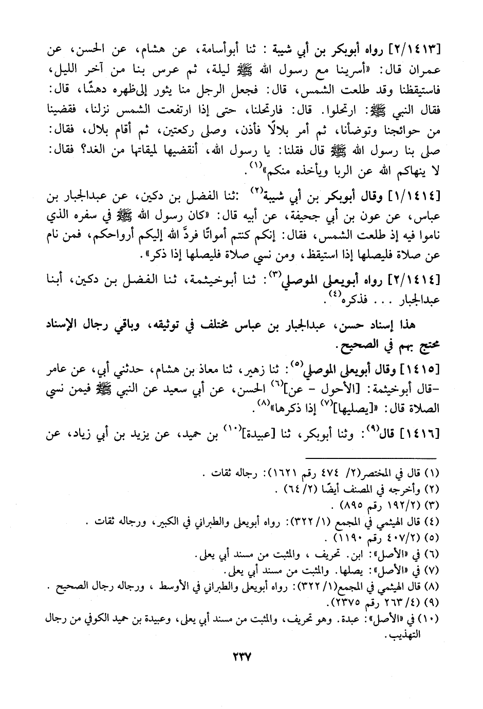1413 / 2 - رَوَاهُ أَبُو بَكْرِ بْنُ أَبِي شَيْبَةَ: ثنا أَبُو أُسَامَةَ، عَنْ هِشَامٍ، عَنِ الْحَسَنِ، عَنْ عِمْرَانَ قَالَ: "أَسْرَيْنَا مَعَ رَسُولِ اللَّهِ - صَلَّى اللَّهُ عَلَيْهِ وَسَلَّمَ - لَيْلَةً، ثُمَّ عَرَّسَ بِنَا مِنْ آخِرِ الْلَيْلِ، فَاسْتَيْقَظْنَا وَقَدْ طَلَعَتِ الشَّمْسُ، قَالَ: فَجَعَلَ الرَّجُلُ مِنَّا يَثُورُ إِلَى ظَهْرِهِ دَهْشًا، قَالَ: فَقَالَ النَّبِيُّ - صَلَّى اللَّهُ عَلَيْهِ وَسَلَّمَ -: ارْتَحِلُوا. قَالَ: فَارْتَحَلْنَا، حَتَّى إِذَا ارْتَفَعَتِ الشمس نزلنا، فقضينا من حَوَائِجَنَا وَتَوَضَّأْنَا، ثُمَّ أَمَرَ بِلَالًا فَأَذَّنَ، وَصَلَّى رَكْعَتَيْنِ، ثُمَّ أَقَامَ بِلَالٌ، فَقَالَ: صَلَّى بِنَا رَسُولُ اللَّهِ - صَلَّى اللَّهُ عَلَيْهِ وَسَلَّمَ - قال فَقُلْنَا: يَا رَسُولَ اللَّهِ، أَنَقْضِيهَا لِمِيقَاتِهَا مِنَ الْغَدِ؟ فَقَالَ: لَا يَنْهَاكُمُ اللَّهُ عَنِ الرِّبَا وَيَأْخُذُهُ مِنْكُمْ ".