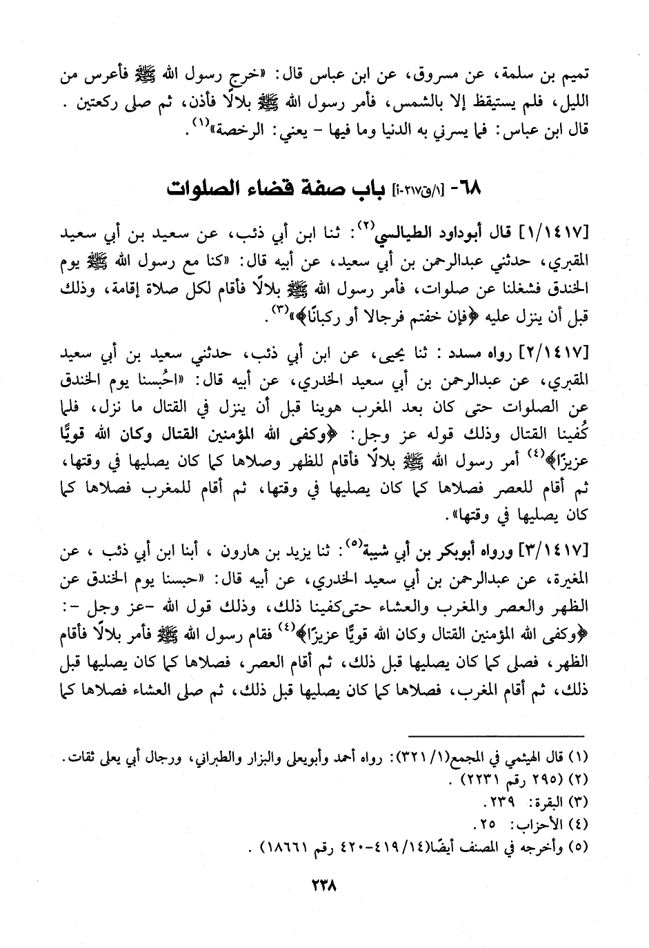 1417 / 3 - وَرَوَاهُ أَبُو بَكْرِ بْنُ أَبِي شَيْبَةَ: ثَنَا يَزِيدُ بن هارون، أبنا ابْنُ أَبِي ذِئْبٍ، عَنِ الْمُغِيرَةِ، عَنْ عَبْدِ الرَّحْمَنِ بْنِ أَبِي سَعِيدٍ الْخُدْرِيِّ، عَنْ أَبِيهِ قالَ: "حُبِسْنَا يَوْمَ الْخَنْدَقِ عَنِ الظُّهْرِ وَالْعَصْرِ وَالْمَغْرِبِ وَالْعِشَاءِ حَتَّى كُفِينَا ذَلِكَ، وَذَلِكَ قَوْلُ اللَّهِ- عَزَّ وَجَلَّ-: {وَكَفَى اللَّهُ الْمُؤْمِنِينَ الْقِتَالَ وكان الله قويًّا عزيزًا} فَقَامَ رَسُولُ اللَّهِ - صَلَّى اللَّهُ عَلَيْهِ وَسَلَّمَ - فَأَمَرَ بِلَالًا فَأَقَامَ الظُّهْرَ، فَصَلَّى كَمَا كَانَ يُصَلِّيهَا قَبْلَ ذَلِكَ، ثُمَّ أَقَامَ الْعَصْرَ، فَصَلَّاهَا كَمَا كَانَ يُصَلِّيهَا قَبْلَ ذَلِكَ، ثُمَّ أَقَامَ الْمَغْرِبَ، فَصَلَّاهَا كَمَا كَانَ يُصَلِّيهَا قَبْلَ ذَلِكَ، ثُمَّ صَلَّى الْعِشَاءَ فَصَلَّاهَا كَمَا