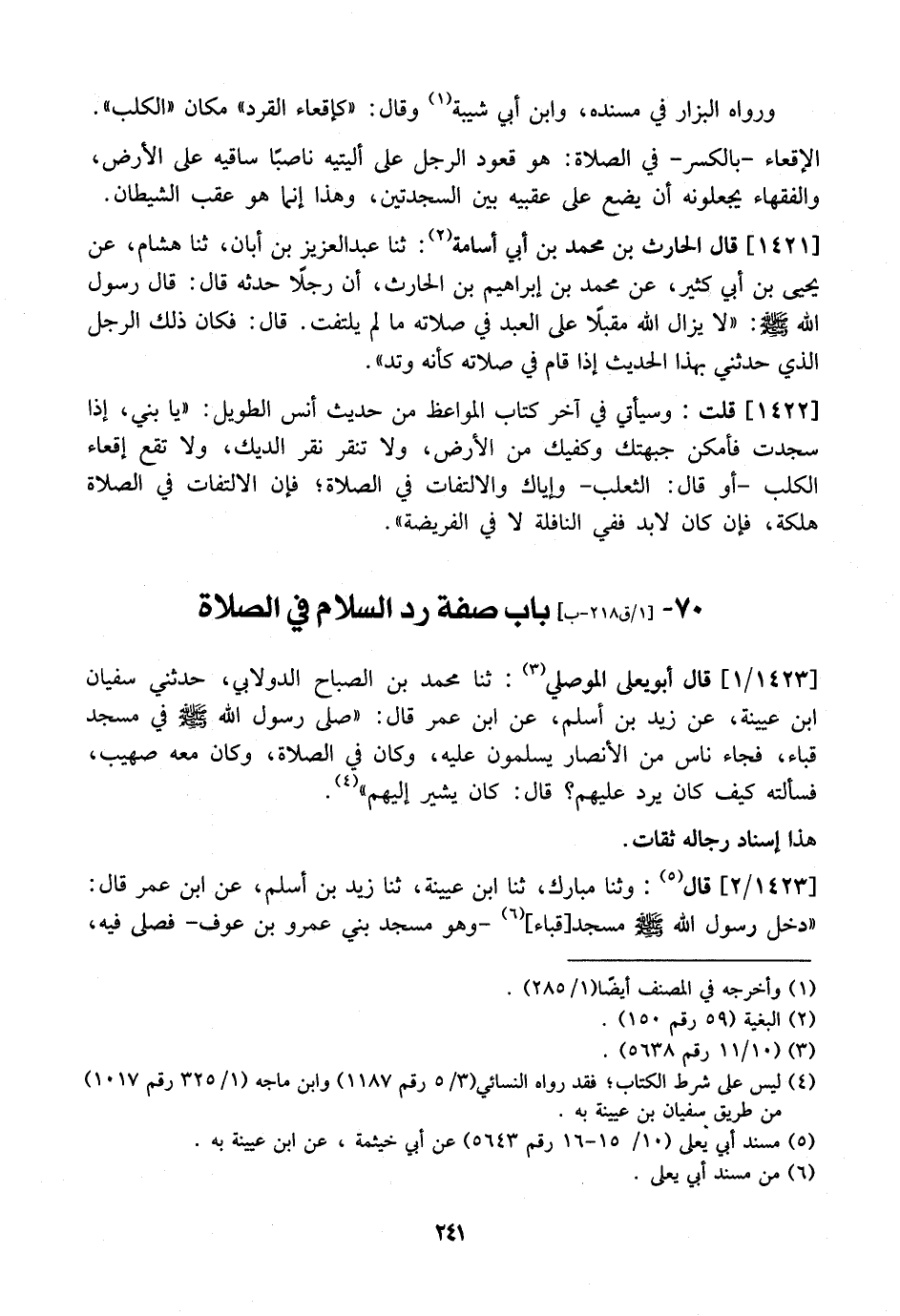 1423 / 1 - قَالَ أَبُو يَعْلَى الْمَوْصِلِيُّ: ثَنَا مُحَمَّدُ بْنُ الصباح الدولابي، حدثني سفيان ابْنُ عُيَيْنَةَ، عَنْ زَيْدِ بْنِ أَسْلَمَ، عَنِ ابْنِ عُمَرَ قَالَ: "صَلَّى رَسُولُ اللَّهِ - صَلَّى اللَّهُ عَلَيْهِ وَسَلَّمَ - فِي مَسْجِدِ قُبَاءَ، فَجَاءَ نَاسٌ مِنَ الْأَنْصَارِ يُسَلِّمُونَ عَلَيْهِ، وَكَانَ فِي الصَّلَاةِ، وَكَانَ مَعَهُ صُهَيْبٌ، فَسَأَلْتُهُ كَيْفَ كَانَ يَرُدُّ عَلَيْهِمْ؟ قَالَ: كَانَ يُشِيرُ إِلَيْهِمْ ".