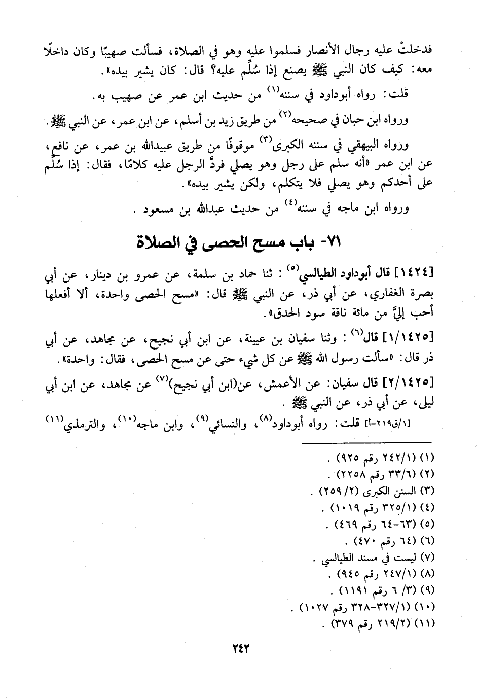 1424 - قَالَ أَبُو دَاوُدَ الطَّيَالِسِيُّ: ثَنَا حَمَّادُ بْنُ سَلَمَةَ، عَنْ عَمْرِو بْنُ دِينَارٍ، عَنْ أَبِي بَصْرَةَ الْغَفَّارِيِّ، عَنْ أَبِي ذَرٍّ، عَنِ النَّبِيِّ - صَلَّى اللَّهُ عَلَيْهِ وَسَلَّمَ - قَالَ: "مسح الحصى واحدة، ألا أَفْعَلَهَا أَحَبُّ إليَّ مِنْ مِائَةِ نَاقَةٍ سُودِ الْحُدُقِ.
