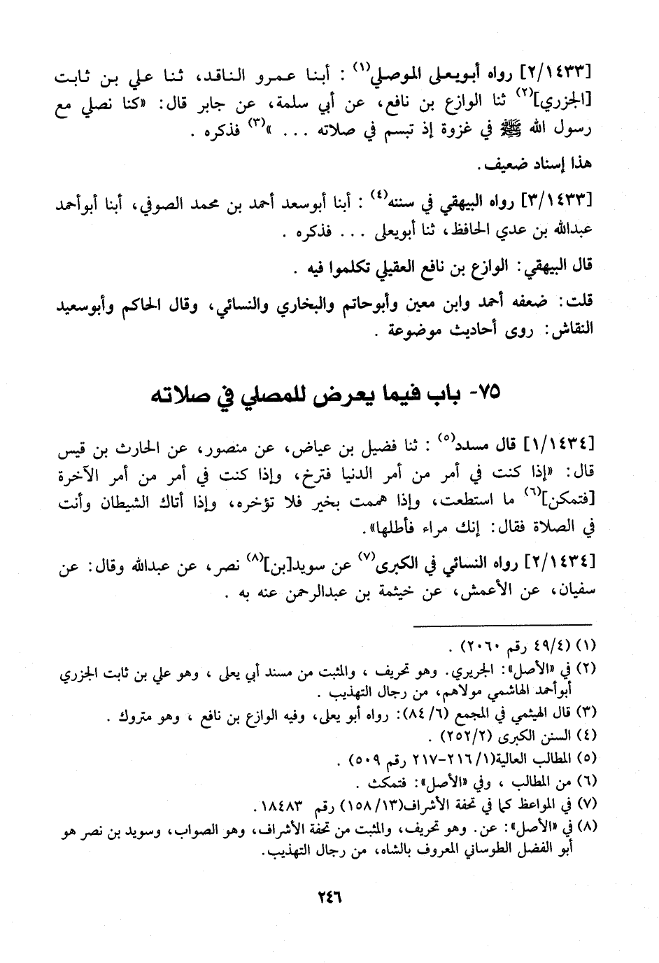 1433 / 2 - رواه أبو يعلى الموصلي: أبنا عَمْرُو النَّاقِدُ، ثنا عَلِيُّ بْنُ ثَابِتٍ الْجَزَرِيِّ، ثَنَا الْوَازِعُ بْنُ نَافِعٍ، عَنْ أَبِي سَلَمَةَ، عَنْ جَابِرٍ قَالَ: "كُنَّا نُصَلِّي مَعَ رَسُولِ اللَّهِ - صَلَّى اللَّهُ عَلَيْهِ وَسَلَّمَ - في غزوة إِذَ تَبَسَّمَ فِي صَلَاتِهِ ... " فَذَكَرَهُ.