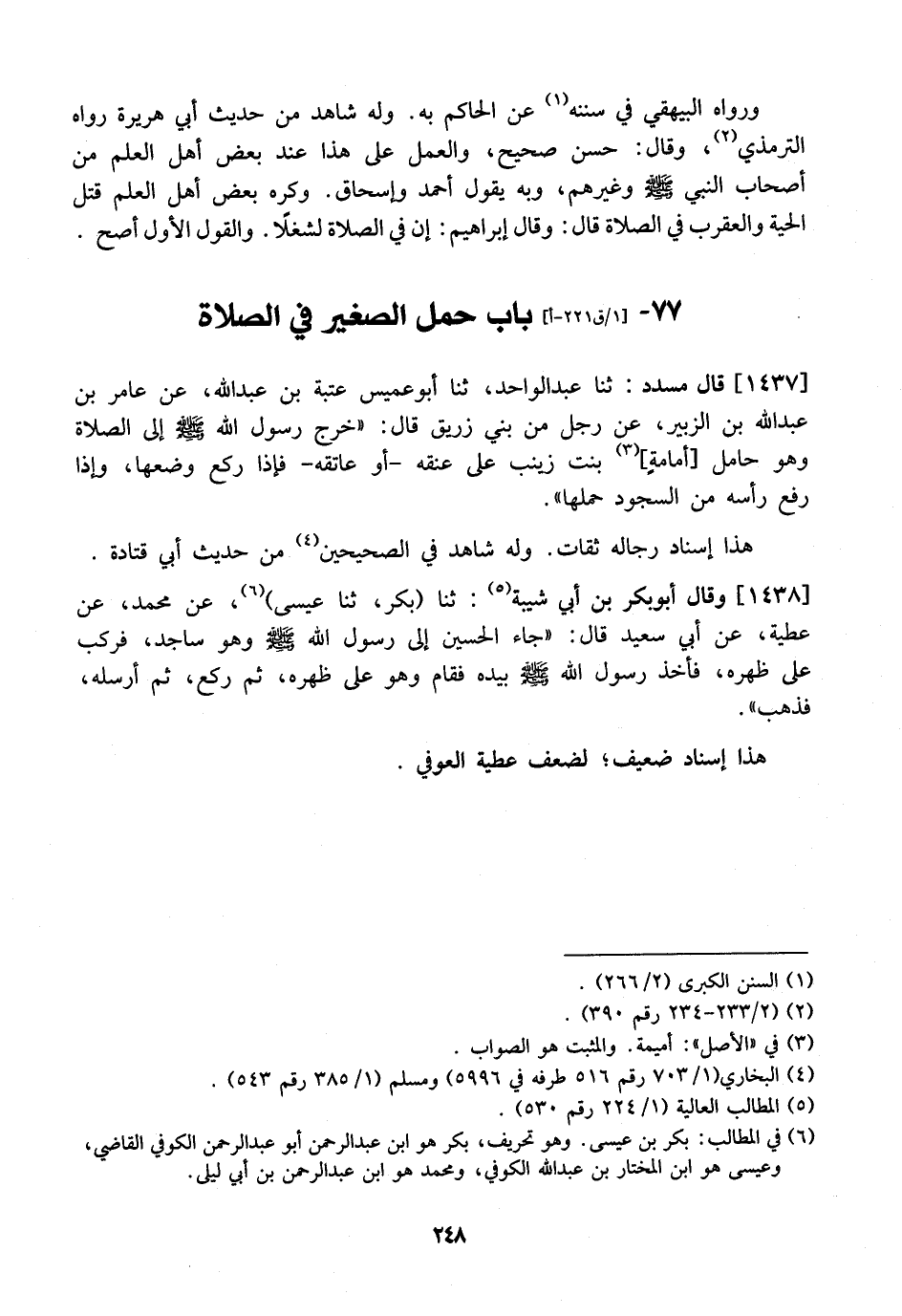 1438 - وَقَالَ أَبُو بَكْرِ بْنُ أَبِي شَيْبَةَ: ثَنَا (بَكْرٌ، ثَنَا عِيسَى) ، عَنْ مُحَمَّدٍ، عَنْ عطية، عن أبي سعيد قالت: "جَاءَ الْحُسْيَنُ إِلَى رَسُولِ اللَّهِ - صَلَّى اللَّهُ عَلَيْهِ وَسَلَّمَ - وَهُوَ سَاجِدٌ، فَرَكِبَ عَلَى ظَهْرِهِ، فَأَخَذَ رَسُولُ اللَّهِ - صَلَّى اللَّهُ عَلَيْهِ وَسَلَّمَ - بِيَدِهِ فقام وهو على ظهره، ثم ركع، ثُمَّ أَرْسَلَهُ، فَذَهَبَ ".