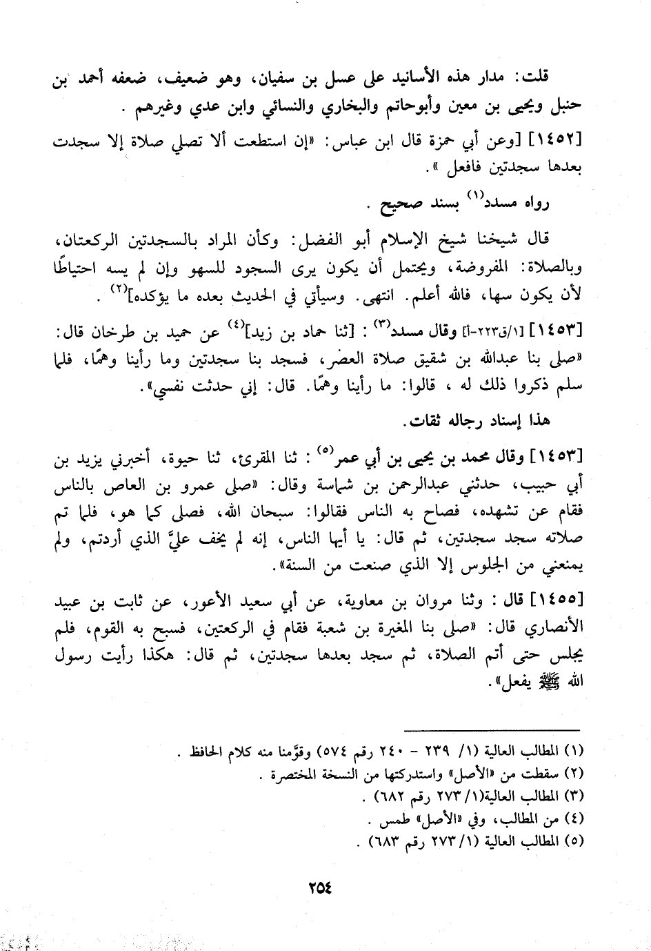 1453 - وَقَالَ مُسَدَّدُ: ثَنَا حَمَّادُ بْنُ زَيْدٍ، عَنْ حميد بن طرخان قَالَ: "صَلَّى بِنَا عَبْدُ اللَّهِ بْنُ شَقِيقٍ صَلَاةَ الْعَصْرِ، فَسَجَدَ بِنَا سَجْدَتَيْنِ وَمَا رَأَيْنَا وَهْمًا فَلَمَّا سَلَّمَ ذَكَرُوا ذَلِكَ لَهُ، قَالُوا: مَا رَأَيْنَا وَهْمًا. قَالَ: إِنِّي حَدَّثْتُ نَفْسِي ".
