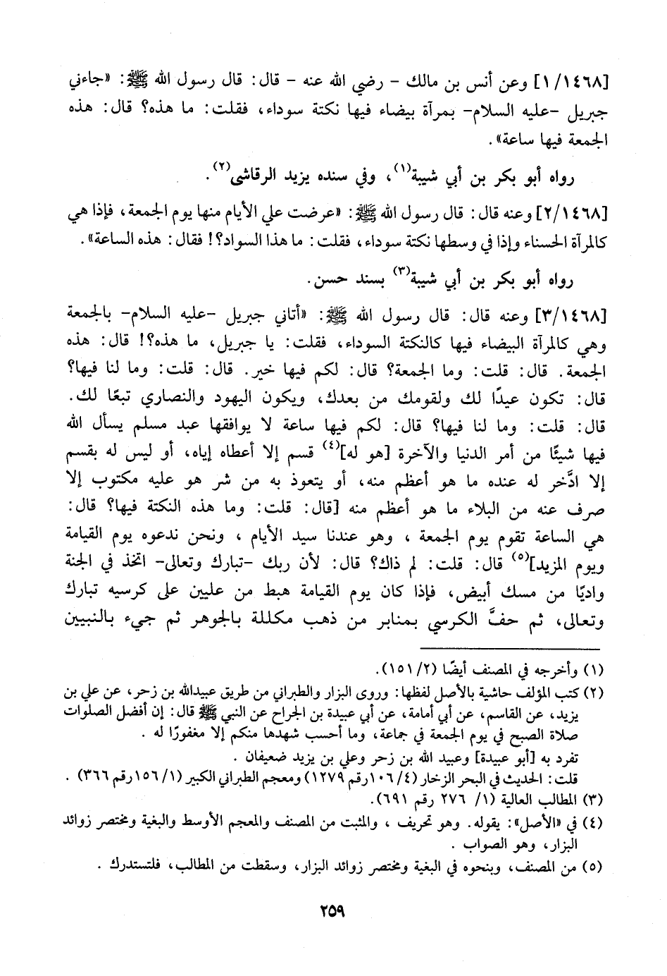 1468 / 2 - وَعَنْهُ قَالَ: قَالَ رَسُولُ اللَّهِ - صَلَّى اللَّهُ عَلَيْهِ وسلم -: "عرضت علي الأيام منها يَوْمُ الْجُمُعَةِ، فَإِذَا هِيَ كَالْمِرْآةِ الْحَسْنَاءِ وَإِذَا فِي وَسَطِهَا نَكْتَةٌ سَوْدَاءُ، فَقُلْتُ: مَا هَذَا السَّوَادُ؟ فَقَالَ: هَذِهِ السَّاعَةُ". رَوَاهُ أَبُو بَكْرِ بْنُ أَبِي شَيْبَةَ بِسَنَدٍ حَسَنٍ.