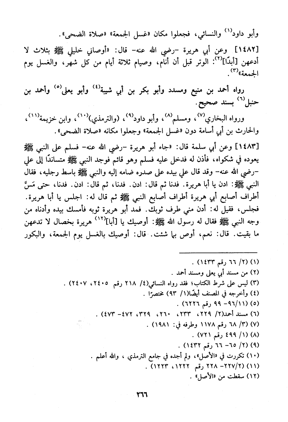 1482 - وَعَنْ أَبِي هُرَيْرَةَ- رَضِيَ اللَّهُ عَنْهُ- قَالَ: "أوصاني خليلي بثلاث لا أدعهن أبدًا: الْوِتْرِ قَبْلَ أَنْ أَنَامَ، وَصِيَامِ ثَلَاثَةِ أَيَّامٍ مِنْ كُلِّ شَهْرٍ، وَالْغُسْلِ يَوْمَ الْجُمُعَةِ".
