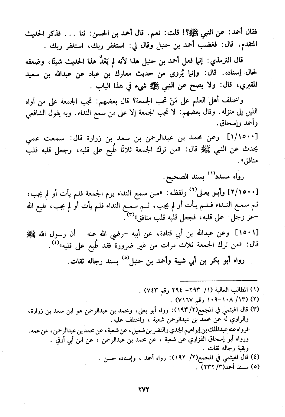 1500 / 1 - وَعَنْ مُحَمَّدِ بْنِ عَبْدِ الرحمن بن سعد بن زُرَارَةَ قالت: سَمِعْتُ عَمِّي يُحَدِّثُ عَنِ النَّبِيِّ - صَلَّى اللَّهُ عَلَيْهِ وَسَلَّمَ - قَالَ: "مَنْ تَرَكَ الْجُمُعَةَ ثَلَاثًا طُبع عَلَى قَلْبِهِ، وَجُعِلَ قَلْبُهُ قَلْبَ مُنَافِقٍ ".