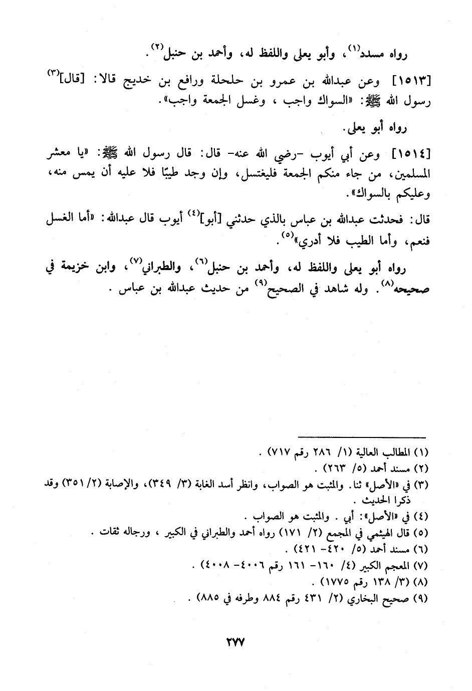 1513 - وَعَنْ عَبْدِ اللَّهِ بْنِ عَمْرِو بن حلحلة ورافع بن خديج قَالَا: قَالَ رَسُولُ اللَّهِ - صَلَّى اللَّهُ عَلَيْهِ وسلم -: "السِّوَاكُ وَاجِبٌ، وَغُسْلُ الْجُمُعَةِ وَاجِبٌ ".