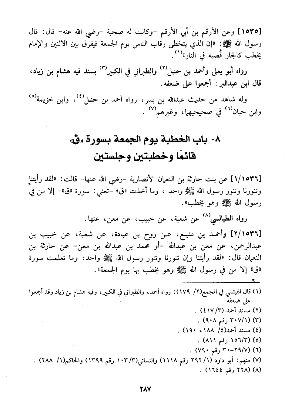 1535 - وَعَنِ الْأَرْقَمِ بْنِ أَبِي الْأَرْقَمِ- وَكَانَتْ لَهُ صُحْبَةٌ- رَضِيَ اللَّهُ عَنْهُ- قَالَ: قَالَ رَسُولُ اللَّهِ - صَلَّى اللَّهُ عَلَيْهِ وَسَلَّمَ -: "إِنَّ الَّذِي يَتَخَطَّى رِقَابَ النَّاسِ يَوْمَ الْجُمُعَةِ فَيُفَرِّقُ بَيْنَ الاثنين والإمام يخطب كالجار قُصبه في النَّارِ".