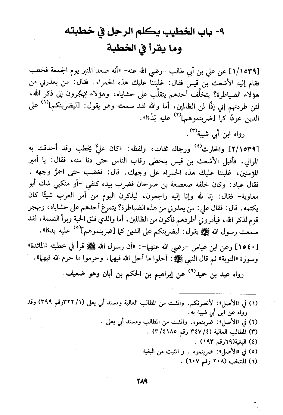 1539 / 2 - وَالْحَارِثُ وَرِجَالُهُ ثِقَاتٌ، وَلَفْظُهُ: "كَانَ عَلِيٌّ يَخْطُبُ وَقَدْ أَحْدَقَتْ بِهِ الْمَوَالِي، فَأَقْبَلَ الْأَشْعَثُ بْنُ قَيْسٍ يَتَخَطَّى رِقَابَ النَّاسِ حَتَّى دَنَا مِنْهُ، فَقَالَ: يا أمير المؤمنين، غلبتنا عليك هذه الحمراء عَلَى وَجْهِكَ. قَالَ: فَغَضِبَ حَتَّى احمرَّ وَجْهُهُ. فقال عباد: وَكَانَ خَلْفَهُ صَعْصَعَةُ بْنُ صَوْحَانَ فَضَرَبَ بِيَدِهِ كَتِفِي- أَوْ مِنْكَبِي شَكَّ أَبُو مُعَاوِيَةَ- فَقَالَ: إِنَّا للِّهِ وَإِنَّا إِلَيْهِ رَاجِعُونَ، لَيَذْكُرَنَّ الْيَوْمَ مِنْ أَمْرِ الْعَرَبِ شَيْئًا كَانَ يَكْتُمُهُ. قَالَ: فَقَالَ عَلِيٌّ: مَنْ يُعَذِّرُنِي مِنْ هَذِهِ الضَّيَاطِرَةِ؟ يَتَمَرَّغُ أَحَدُهُمْ عَلَى حَشَايَاهُ، وَيهَجَّرُ قَوْمٌ لِذِكْرِ اللَّهِ، فَيَأْمُرُونِي أَطْرُدُهُمْ فَأَكُونُ مِنَ الظَّالِمِينَ، أَمَا وَالَّذِي فَلَقَ الْحَبَّةَ وَبَرَأَ النَّسْمَةَ، لَقَدْ سَمِعْتُ رَسُولَ اللَّهِ - صَلَّى اللَّهُ عَلَيْهِ وسلم - يقول: ليضربنكم على الدين كما ضربتموهم عَلَيْهِ بَدْءًا".
