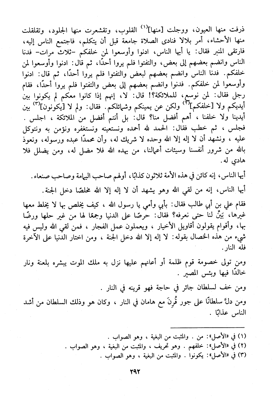 ذَرَفَتْ مِنْهَا الْعُيُونُ، وَوَجِلَتْ مِنْهَا الْقُلُوبُ، وَتَقَشْعَرَتْ مِنْهَا الْجُلُودُ، وَتَقَلْقَلَتْ مِنْهَا الْأَحْشَاءُ، أَمَرَ بِلَالًا فَنَادَى الصلاةٍ جَامِعَةٍ قَبْلَ أَنْ يَتَكَلَّمَ، فَاجْتَمَعَ الناس إليه، فارتقى المنبر فقال: يا أَيُّهَا النَّاسُ، ادْنُوا وَأَوْسِعُوا لِمَنْ خَلْفَكُمْ- ثَلَاثَ مَرَّاتٍ- فَدَنَا النَّاسُ وَانْضَمَّ بَعْضُهُمْ إِلَى بَعْضٍ، والتفتوا فلم يروا أحدا، ثم قال: ادنوا وَأَوْسِعُوا لِمَنْ خَلْفَكُمْ. فَدَنَا النَّاسُ وَانْضَمَّ بَعْضُهُمْ لِبَعْضٍ وَالْتَفَتُوا فَلَمْ يَرَوْا أَحَدًا، ثمّ قال: ادنوا وأوسعوا لمن خلفكم. فدنوا وانضم بعضهم إلى بعض والتفتوا فلم يروا أحداً، فَقَامَ رَجُلٌ فَقَالَ: لِمَنْ نُوَسِّعُ لِلْمَلَائِكَةِ؟ قَالَ: لَا، إِنَّهُمْ إِذَا كَانُوا مَعَكُمْ لَمْ يَكُونُوا بَيْنَ أيديكم ولا أخلفكم،) وَلَكِنْ عَنْ يَمِينِكُمْ وَشَمَائِلِكُمْ. فَقَالَ: وَلِمَ لَا يَكَونُونَ بَيْنَ أَيْدِينَا وَلَا خَلْفَنَا، أَهُمْ أَفْضَلُ مِنَّا؟ قَالَ: بَلْ أَنْتُمْ أَفْضَلُ مِنَ الْمَلَائِكَةِ، اجْلِسْ. فَجَلَسَ، ثُمَّ خَطَبَ فَقَالَ: الْحَمْدُ لِلَّهِ أحمده وَنَسْتَعِينُهُ وَنَسْتَغْفِرُهُ وَنُؤْمِنُ بِهِ وَنَتَوَكَّلُ عَلَيْهِ، وَنَشْهَدُ أَنْ لَا إِلَهَ إِلَّا اللَّهُ وَحْدَهُ لَا شَرِيكَ لَهُ، وَأَنَّ مُحَمَّدًا عَبْدُهُ وَرَسُولُهُ، وَنَعُوذُ بِاللَّهِ مِنْ شُرُورِ أَنْفُسِنَا وَسَيِّئَاتِ أَعْمَالِنَا، مَنْ يَهْدِهِ اللَّهُ فَلَا مُضِلَّ لَهُ، وَمَنْ يُضْلِلْ فَلَا هَادِيَ لَهُ.