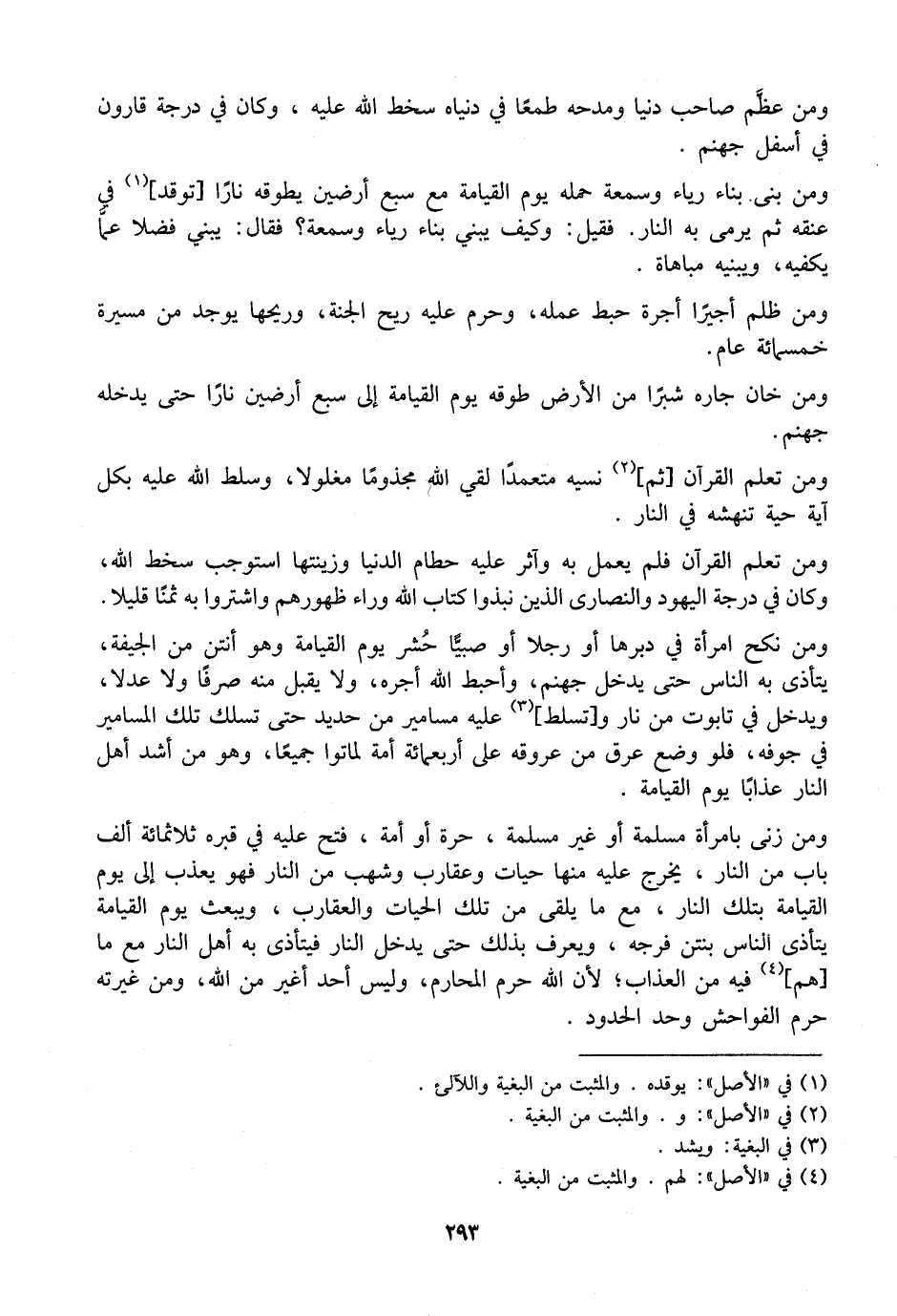 ومن تعلم القرآن فلم يَعْمَلْ بِهِ وَآثَرَ عَلَيْهِ حُطَامَ الدُّنْيَا وَزِينَتَهَا اسْتَوْجَبَ سَخَطَ اللَّهِ، وَكَانَ فِي دَرَجَةِ الْيَهُودِ وَالنَّصَارَى الَّذِينَ نَبَذُوا كِتَابَ اللَّهِ وَرَاءَ ظُهُورِهِمْ وَاشْتَرَوْا بِهِ ثَمَنًا قَلِيلًا. وَمَنْ نَكَحَ امْرَأَةً فِي دُبُرِهَا أَوْ رَجُلًا أَوْ صَبِيًّا حُشر يوم القيامة وهو أنتن من الجيفة، يتأذى بِهِ الناس حتّى يدخل جهنم، وأحبط الله أجره، ولا يقبل منه صرفا ولا عدلا، ويدخل في تَابُوتٌ مِنْ نَارٍ وَتُسَلَّطُ عَلَيْهِ مَسَامِيرُ مِنْ حَدِيدٍ حَتَّى تَسْلُكَ تِلْكَ الْمَسَامِيرُ فِي جَوْفِهِ، فَلَوْ وُضِعَ عِرْقٌ مِنْ عُرُوقِهِ على أربعمائة أُمَّةٍ لَمَاتُوا جَمِيعًا، وَهُوَ مِنْ أَشَدِّ أَهْلِ النار عذابًا يوم القيامة.