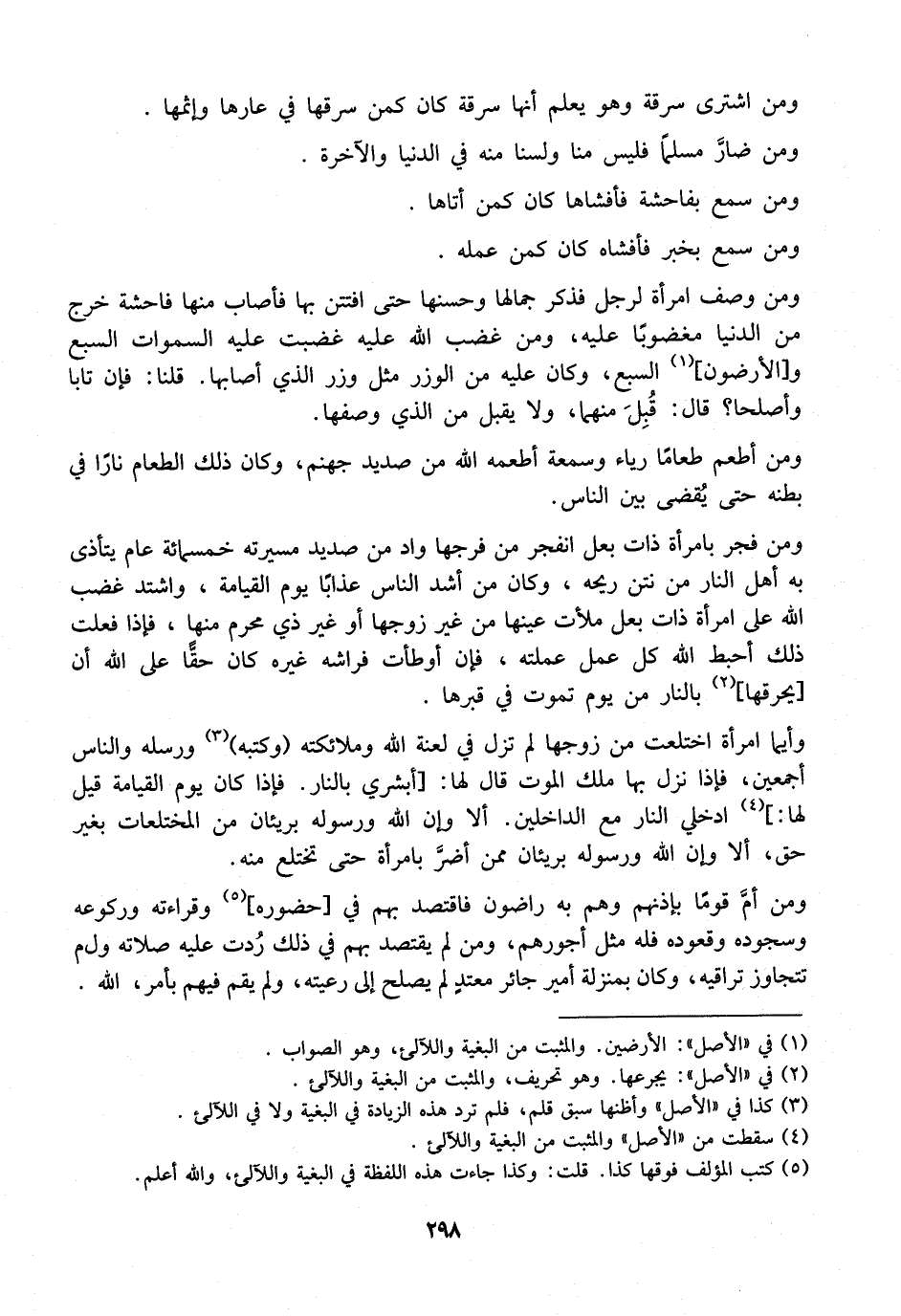 وَمَنْ وَصَفَ امْرَأَةً لِرَجُلٍ فَذَكَرَ جَمَالَهَا وَحُسْنَهَا حَتَّى افْتَتَنَ بِهَا فَأَصَابَ مِنْهَا فَاحِشَةً خَرَجَ مِنَ الدُّنْيَا مَغْضُوبًا عَلَيْهِ، وَمَنْ غضب الله عليه غضبت عليه السموات السَّبْعُ وَالْأَرَضُونُ السَّبْعُ وَكَانَ عَلَيْهِ مِنَ الْوِزْرِ مثل وزر الذي أصابها. قلنا: فإن تابا وأصلحا؟ قَالَ: قُبِلَ مِنْهُمَا، وَلَا يُقْبَلُ مِنَ الَّذِي وَصَفَهَا.