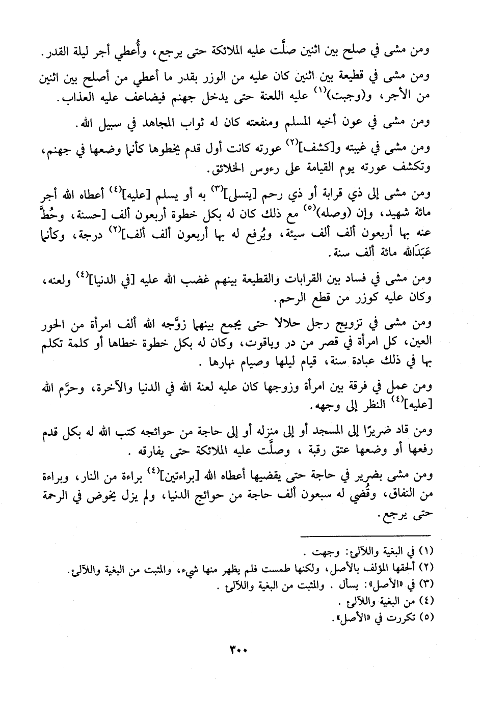 وَمَنْ مَشَى فِي صُلْحٍ بَيْنَ اثْنَيْنِ صلَّت عليه الملائكة حتى يرجع، وأُعطي أجر ليلة القدر. ومن مشى في قطيعة بَيْنَ اثْنَيْنِ كَانَ عَلَيْهِ مِنَ الْوِزْرِ بِقَدْرِ مَا أُعْطِيَ مَنْ أَصْلَحَ بَيْنَ اثْنَيْنِ مِنَ الْأَجْرِ، وَوَجَبَتْ عَلَيْهِ اللَّعْنَةُ حَتَّى يَدْخُلَ جَهَنَّمَ فَيُضَاعَفُ عَلَيْهِ الْعَذَابُ. وَمَنْ مَشَى فِي عَوْنِ أخيه المسلم ومنفعته كان له ثواب المجاهد فِي سَبِيلِ اللَّهِ.
