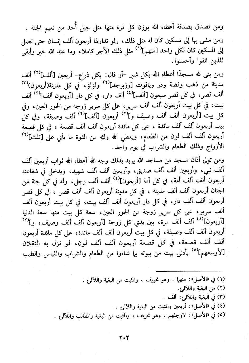 وَمَنْ بَنَى لِلَّهِ مَسْجِدًا أَعْطَاهُ اللَّهُ بِكُلِّ شِبْرٍ- أَوْ قَالَ: بِكُلِّ ذِرَاعٍ- أربعين ألف أَلْفَ مَدِينَةٍ مِنْ ذَهَبٍ وَفِضَّةٍ وَدُرٍّ وَيَاقُوتٍ وَزَبَرْجَدٍ وَلُؤْلُؤٍ فِي كُلِّ مَدِينَةٍ أَرْبَعُونَ أَلْفَ قَصْرٍ، في كل قصر سبعون أَلْفَ أَلْفِ دَارٍ فِي كُلِّ دَارٍ أَرْبَعُونَ أَلْفَ أَلْفِ بَيْتٍ، فِي كُلِّ بَيْتٍ أَرْبَعُونَ أَلْفَ أَلْفِ سَرِيرٍ، عَلَى كُلِّ سَرِيرٍ زَوْجَةٌ مِنَ الْحُورِ الْعِينِ، وَفِي كُلِّ بَيْتٍ أَرْبَعُونَ ألف ألف وصيف وأربعون ألف ألف وَصِيفَةً، وَفِي كُلِّ بَيْتٍ أَرْبَعُونَ أَلْفَ أَلْفِ مَائِدَةٍ، عَلَى كُلِّ مَائِدَةٍ أَرْبَعُونَ أَلْفَ أَلْفِ قَصْعَةٍ، فِي كُلِّ قَصْعَةٍ أَرْبَعُونَ أَلْفَ أَلْفِ لَوْنٍ مِنَ الطَّعَامِ، وَيُعْطِي اللَّهُ وليَّه مِنَ القوة ما يأتي على تلك الْأَزْوَاجِ وَذَلِكَ الطَّعَامُ وَالشَّرَابُ فِي يَوْمٍ وَاحِدٍ.