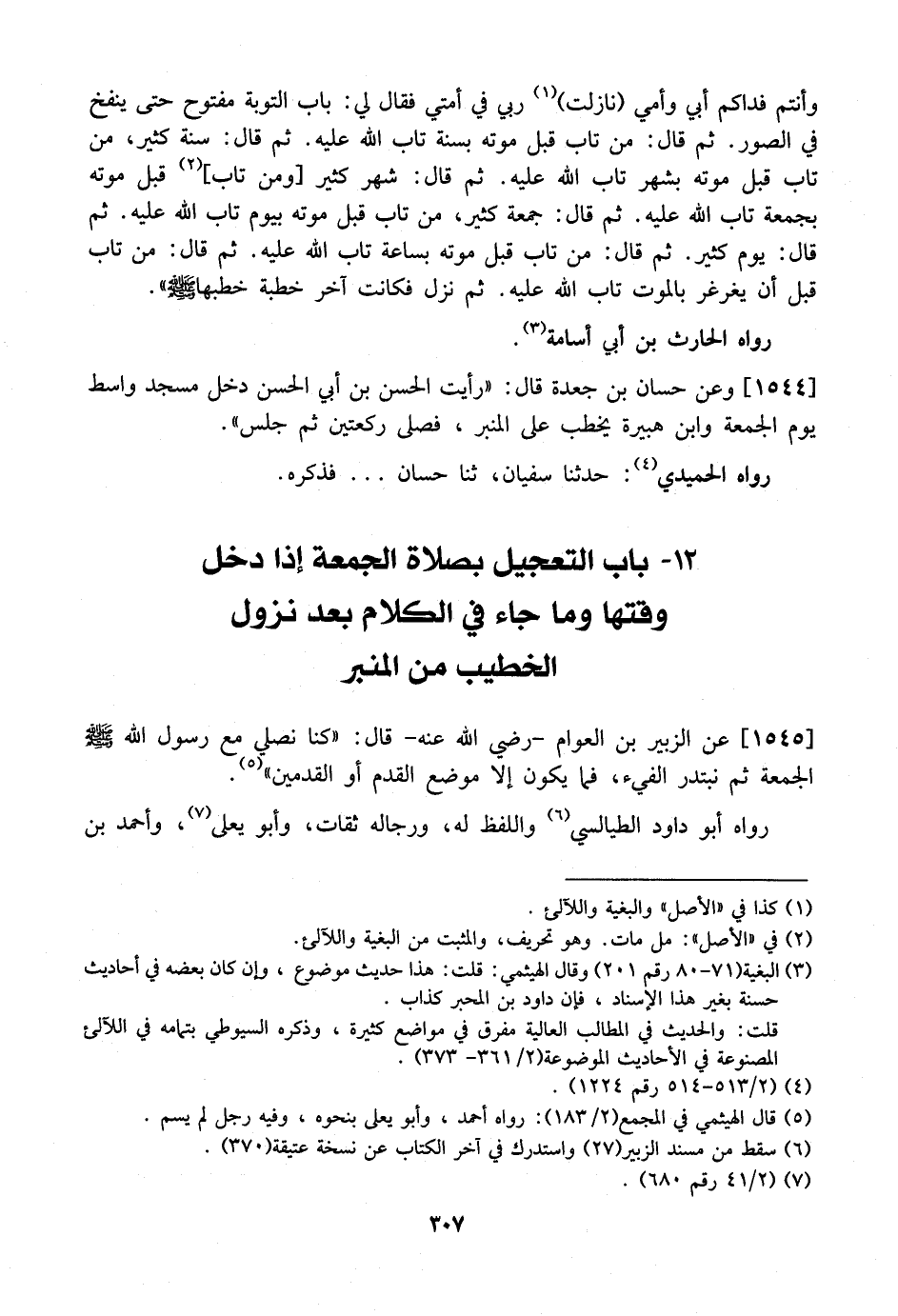 1545 - عَنِ الزُّبَيْرِ بْنِ الْعَوَّامِ- رَضِيَ اللَّهُ عَنْهُ- قَالَ: "كُنَّا نُصَلِّي مَعَ رَسُولِ اللَّهِ - صَلَّى اللَّهُ عَلَيْهِ وَسَلَّمَ - الجمعة ثُمَّ نَبْتَدِرُ الْفَيْءَ، فَمَا يَكُونُ إِلَّا مَوْضِعُ القدم أو القدمين ".