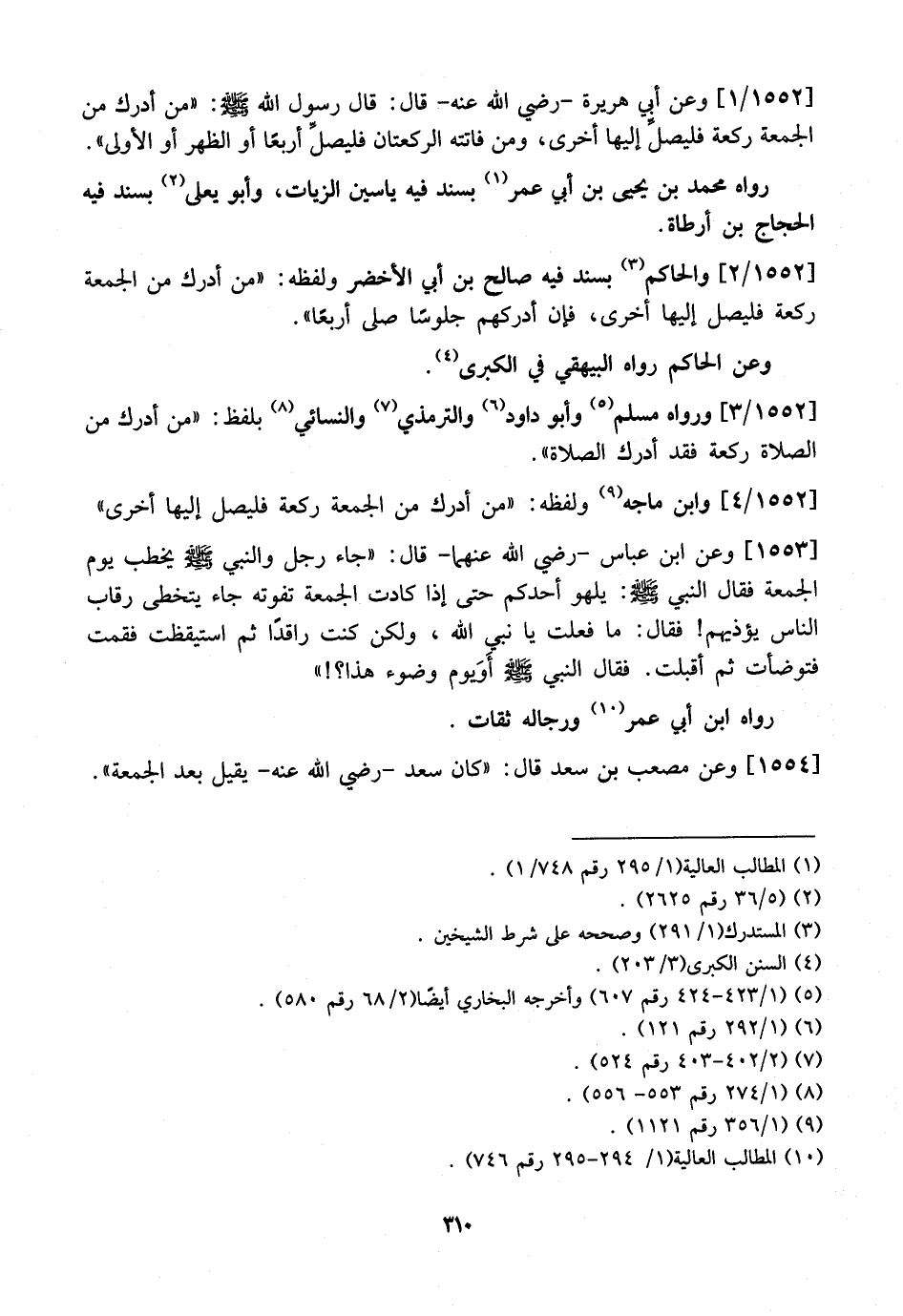 1552 / 2 - والحاكم بِسَنَدٍ فِيهِ صَالِحُ بْنُ أَبِي الْأَخْضَرِ وَلَفْظُهُ: "مَنْ أَدْرَكَ مِنَ الْجُمُعَةِ رَكْعَةً فَلْيُصَلِّ إِلَيْهَا أخرها، فَإِنْ أَدْرَكَهُمْ جُلُوسًا صَلَّى أَرْبَعًا".