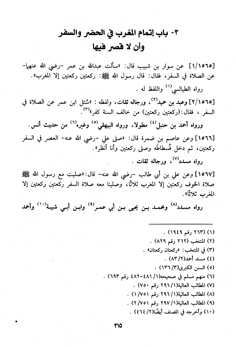1565 / 1 - عَنْ سَوَّارِ بْنِ شَبِيبٍ قَالَ: "سَأَلْتُ عَبْدَ اللَّهِ بْنَ عُمَرَ- رَضِيَ اللَّهُ عَنْهُمَا- عَنِ الصَّلَاةِ فِي السَّفَرِ، فَقَالَ: قال رسول الله: رَكْعَتَيْنِ رَكْعَتَيْنِ إِلَّا الْمَغْرِبَ ". رَوَاهُ الطَّيَالِسِيُّ وَاللَّفْظُ لَهُ.