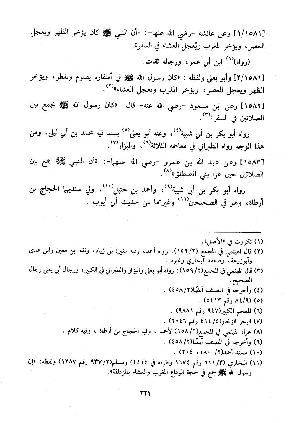 1582 - وَعَنِ ابْنِ مَسْعُودٍ- رَضِيَ اللَّهُ عَنْهُ- قَالَ: "كَانَ رَسُولُ اللَّهِ - صَلَّى اللَّهُ عَلَيْهِ وَسَلَّمَ - يَجْمَعُ بَيْنَ الصَّلَاتَيْنِ فِي السَّفَرِ".
