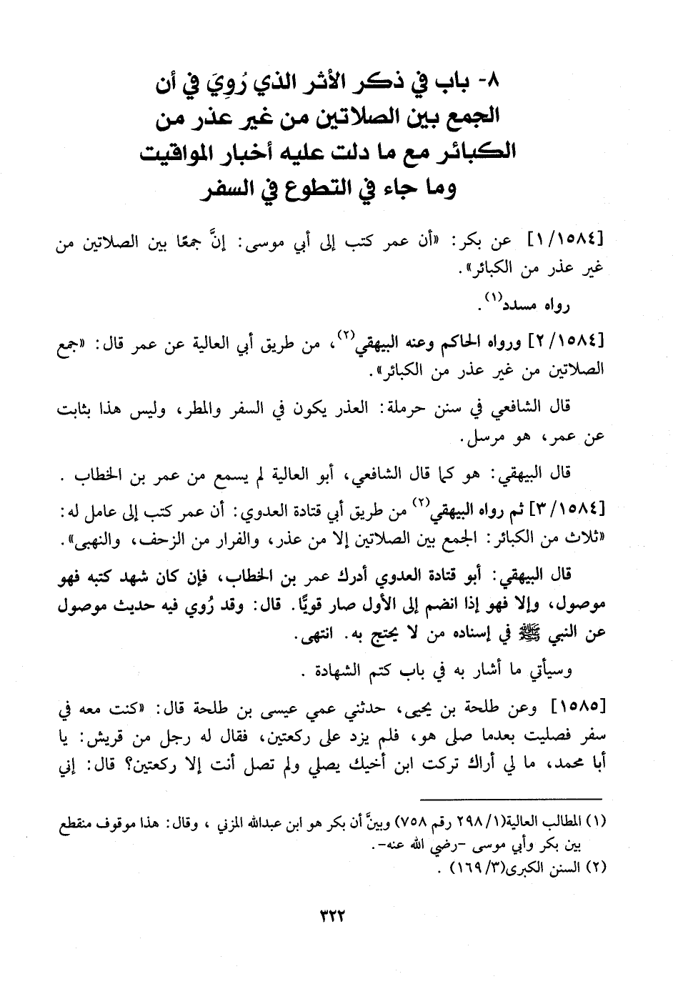 1584 / 2 - وَرَوَاهُ الْحَاكِمُ وَعَنْهُ الْبَيْهَقِيُّ، مِنْ طَرِيقِ أَبِي الْعَالِيَةِ عَنْ عُمَرَ قَالَ: "جَمْعُ الصَّلَاتَيْنِ مِنْ غَيْرِ عُذْرٍ مِنَ الْكَبَائِرِ.
