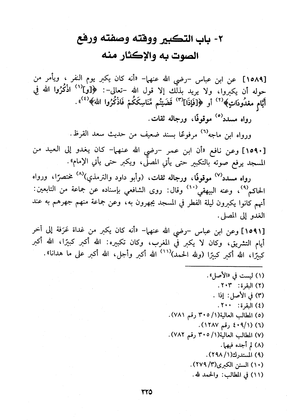 1589 - عَنِ ابْنِ عَبَّاسٍ- رَضِيَ اللَّهُ عَنْهُمَا- "أَنَّهُ كَانَ يُكَبِّرُ يَوْمَ النَّفْرِ، وَيَأْمُرُ مَنْ حَوْلَهُ أَنْ يُكَبِّرُوا، وَلَا يُرِيدُ بِذَلِكَ إِلَّا قَوْلَ اللَّهِ- تَعَالَى-: {واذْكُرُوا اللَّهَ فِي أيام معدودَاتٍ} أو {فَإذَا قَضَيتُم مَّنَاسِكَكُمْ فَاذْكُرُوا اللهَ} ".