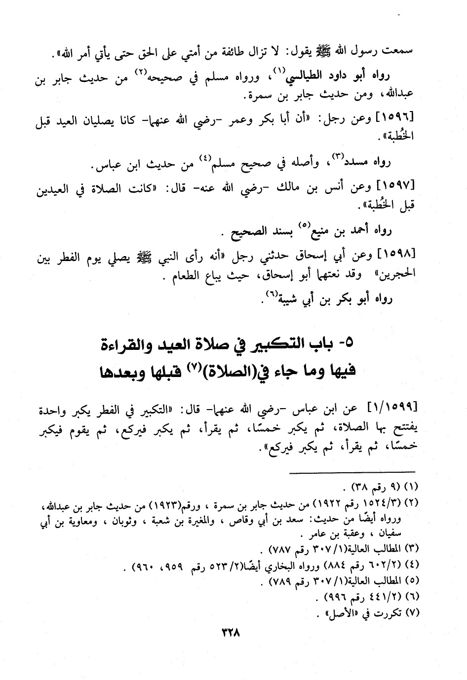1599 / 1 - عَنِ ابْنِ عَبَّاسٍ- رَضِيَ اللَّهُ عَنْهُمَا- قَالَ: "التَّكْبِيرُ فِي الْفِطْرِ يُكَبِّرُ وَاحِدَةً يَفْتَتِحُ بِهَا الصَّلَاةَ، ثُمَّ يُكَبِّرُ خَمْسًا، ثُمَّ يَقْرَأُ، ثُمَّ يُكَبِّرُ فَيَرْكَعُ، ثُمَّ يَقُومُ فَيُكَبِّرُ خَمْسًا، ثُمَّ يَقْرَأُ، ثُمَّ يُكَبِّرُ فَيَرْكَعُ ".
