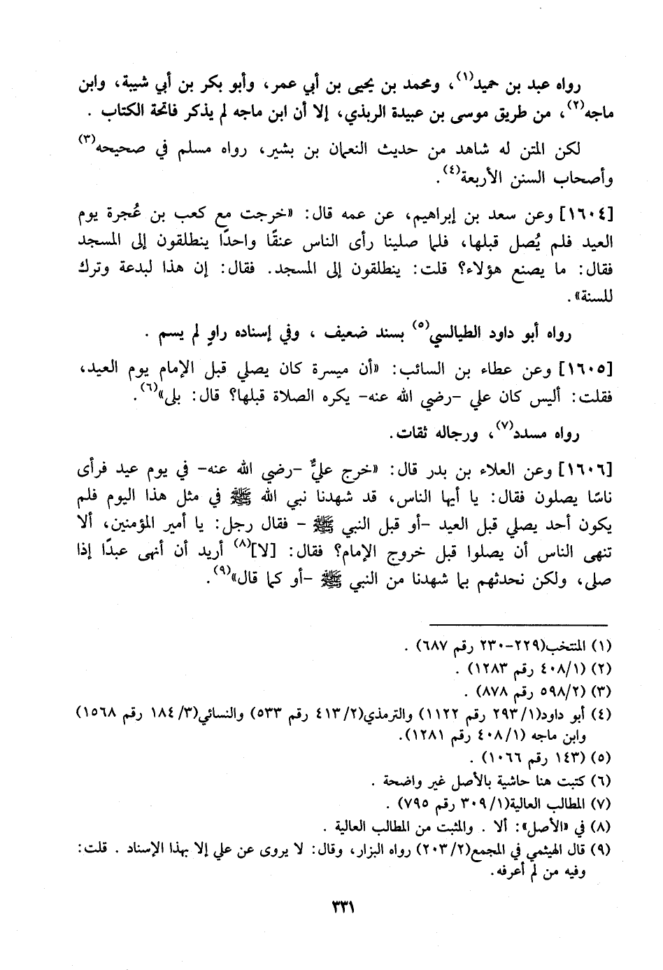 1606 - وعن العلاء بن بدر قال: "خرج عليٌّ - رضي الله عنه- فِي يَوْمِ عِيدٍ فَرَأَى نَاسًا يُصَلُّونَ فَقَالَ: يَا أَيُّهَا النَّاسُ، قَدْ شَهِدْنَا نَبِيَّ اللَّهِ - صَلَّى اللَّهُ عَلَيْهِ وَسَلَّمَ - فِي مثل هذا اليوم فلم يكون أَحَدٌ يُصَلِّي قَبْلَ الْعِيدِ- أَوْ قَبْلَ النَّبِيِّ - صَلَّى اللَّهُ عَلَيْهِ وَسَلَّمَ - فَقَالَ رَجُلٌ: يَا أَمِيرَ الْمُؤْمِنِينَ، أَلَا تَنْهَى النَّاسَ أَنْ يُصَلُّوا قَبْلَ خُرُوجِ الْإِمَامِ؟ فَقَالَ: لَا أُرِيدُ أَنْ أَنْهَى عَبْدًا إِذَا صَلَّى، وَلَكِنْ نُحَدِّثُهُمْ بِمَا شَهِدْنَا مِنَ النَّبِيِّ - صَلَّى اللَّهُ عَلَيْهِ وَسَلَّمَ - أَوْ كَمَا قَالَ ".