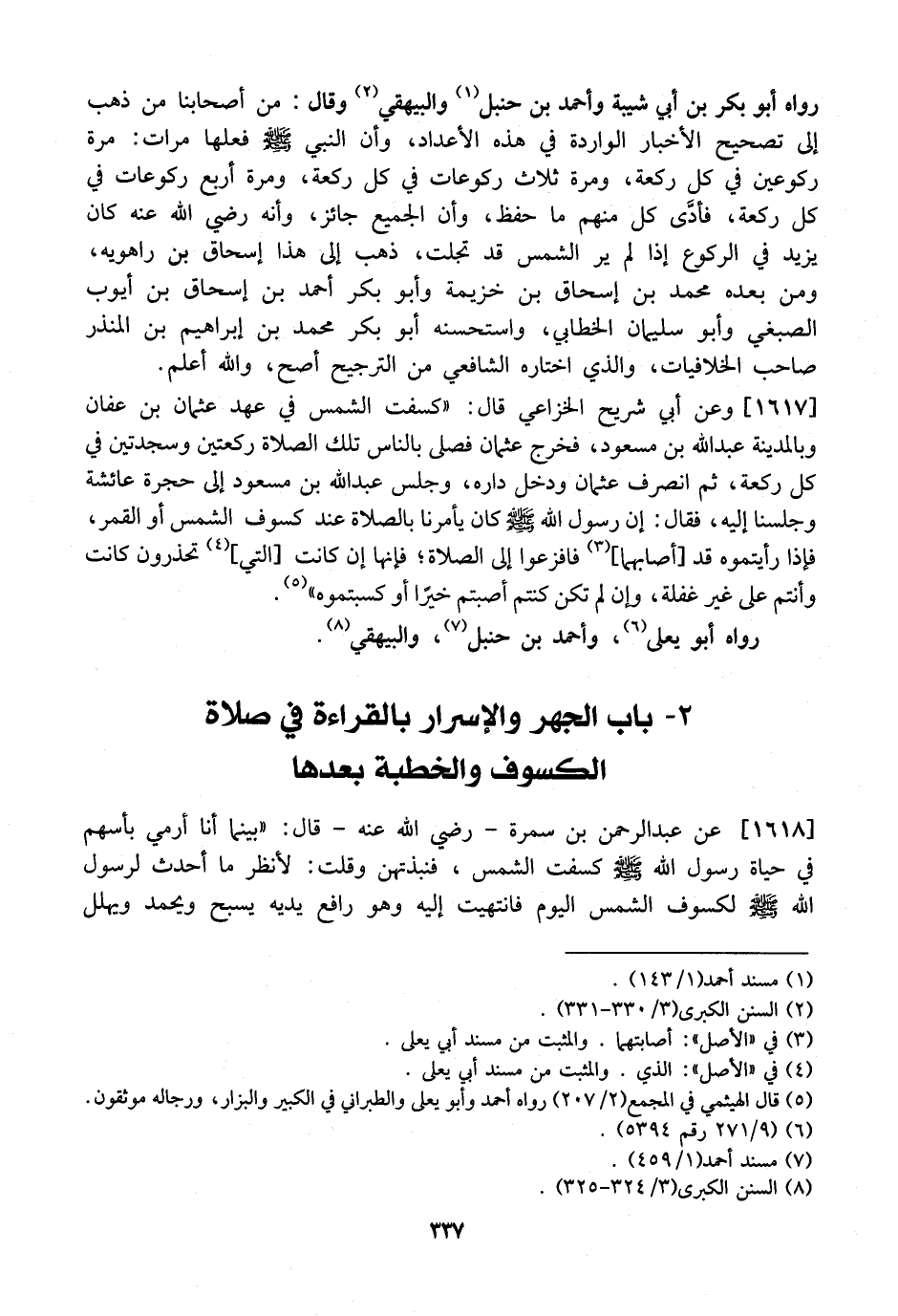 رَوَاهُ أَبُو بَكْرِ بْنُ أَبِي شَيْبَةَ وَأَحْمَدُ بْنُ حَنْبَلٍ وَالْبَيْهَقِيُّ وَقَالَ: مِنْ أَصْحَابِنَا مَنْ ذَهَبَ إِلَى تَصْحِيحِ الْأَخْبَارِ الْوَارِدَةِ فِي هَذِهِ الْأَعْدَادِ، وَأَنَّ النَّبِيَّ - صَلَّى اللَّهُ عَلَيْهِ وَسَلَّمَ - فَعَلَهَا مَرَّاتٍ: مَرَّةً رُكُوعَيْنِ فِي كُلِّ رَكْعَةٍ، وَمَرَّةً ثَلَاثَ رُكُوعَاتٍ فِي كُلِّ رَكْعَةٍ، وَمَرَّةً أَرْبَعَ رُكُوعَاتٍ فِي كُلِّ رَكْعَةٍ، فأدَّى كُلٌّ مِنْهُمْ مَا حَفِظَ، وَأَنَّ الْجَمِيعَ جَائِزٌ، وَأَنَّهُ رضي الله عنه كَانَ يَزِيدُ فِي الرُّكُوعِ إِذَا لَمْ يَرَ الشَّمْسَ قَدْ تَجَلَّتْ، ذَهَبَ إِلَى هَذَا إِسْحَاقُ بْنُ رَاهَوَيْهِ، وَمِنْ بَعْدِهِ مُحَمَّدُ بْنُ إِسْحَاقَ بْنِ خُزَيْمَةَ وَأَبُو بَكْرٍ أَحْمَدُ بْنُ إِسْحَاقَ بن أيوب الصبغي وَأَبُو سُلَيْمَانَ الْخَطَّابِيُّ، وَاسْتَحْسَنَهُ أَبُو بَكْرٍ مُحَمَّدُ بْنُ إِبْرَاهِيمَ بْنِ الْمُنْذِرِ صَاحِبُ الْخِلَافِيَّاتِ، وَالَّذِي اخْتَارَهُ الشَّافِعِيُّ مِنَ التَّرْجِيحِ أَصَحُّ، وَاللَّهُ أَعْلَمُ.