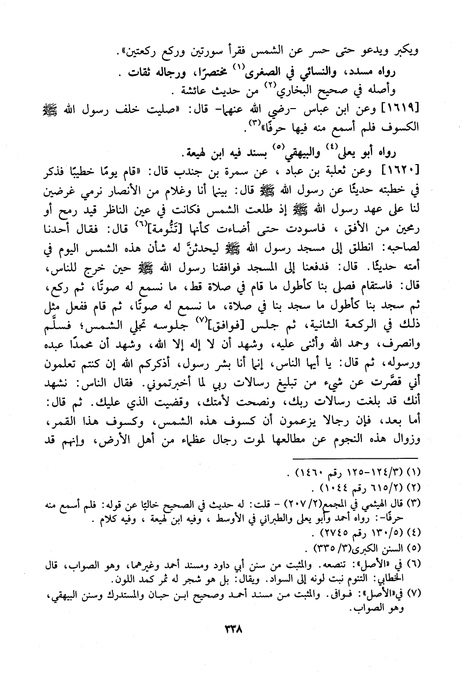 1620 - وَعَنْ ثَعْلَبَةَ بْنِ عَبَّادٍ، عَنْ سَمُرَةَ بْنِ جُنْدُبٍ قَالَ: "قَامَ يَوْمًا خَطِيبًا فَذَكَرَ فِي خُطْبَتِهِ حَدِيثًا عَنْ رَسُولِ اللَّهِ - صَلَّى اللَّهُ عَلَيْهِ وَسَلَّمَ - قَالَ: بَيْنَمَا أَنَا وَغُلَامٌ مِنَ الْأَنْصَارِ نَرْمِي غَرَضَيْنِ لَنَا عَلَى عَهْدِ رَسُولِ اللَّهِ - صَلَّى اللَّهُ عَلَيْهِ وسلم - إذ طَلَعَتِ الشَّمْسُ فَكَانَتْ فِي عَيْنِ النَّاظِرِ قَيْدَ رُمْحٍ أَوْ رُمْحَيْنِ مِنَ الْأُفُقِ، فَاسْوَدَّتْ حَتَّى أضاءت كأنها تَنُّومة، قَالَ: فَقَالَ أَحَدُنَا لِصَاحِبِهِ: انْطَلِقْ إِلَى مَسْجِدِ رسول الله ليحدثنَّ لَهُ شَأْنَ هَذِهِ الشَّمْسِ الْيَوْمَ فِي أُمَّتِهِ حَدِيثًا. قَالَ: فَدَفَعَنَا إِلَى الْمَسْجِدِ فَوَافَقْنَا رَسُولُ اللَّهِ - صَلَّى اللَّهُ عَلَيْهِ وَسَلَّمَ - حِينَ خَرَجَ لِلنَّاسِ، قَالَ: فَاسْتَقَامَ فَصَلَّى بِنَا كَأَطْوَلِ ما قام في صلاة قط، مَا نَسْمَعُ لَهُ صَوْتًا، ثُمَّ رَكَعَ، ثُمَّ سجد بنا كأطول ما سجد بنا في صَلَاةٍ، مَا نَسْمَعُ لَهُ صَوْتًا، ثُمَّ قَامَ فَفَعَلَ مِثْلَ ذَلِكَ فِي الرَّكْعَةِ الثَّانِيَةِ، ثُمَّ جلس فوافق جُلُوسُهُ تَجَلِّي الشَّمْسُ فسلَّم وَانْصَرَفَ، وَحَمِدَ اللَّهَ وَأَثْنَى عَلَيْهِ، وَشَهِدَ أَنَّ لَا إِلَهَ إِلَّا اللَّهُ، وَشَهِدَ أَنَّ مُحَمَّدًا عَبْدُهُ وَرَسُولُهُ، ثُمَّ قَالَ: يَا أَيُّهَا النَّاسُ، إِنَّمَا أَنَا بَشَرٌ رَسُولٌ، أُذَكِّرُكُمُ اللَّهَ إِنْ كُنْتُمْ تَعْلَمُونَ أَنِّي قصَّرت عَنْ شَيْءٍ مِنْ تَبْلِيغِ رِسَالَاتِ رَبِّي لَمَا أَخْبَرْتُمُونِي. فَقَالَ النَّاسُ: نَشْهَدُ أَنَّكَ قَدْ بَلَّغْتَ رِسَالَاتِ رَبِّكَ، وَنَصَحْتَ لِأُمَّتِكَ، وَقَضَيْتَ الَّذِي عَلَيْكَ. ثُمَّ قَالَ: أَمَّا بَعْدُ، فَإِنَّ رِجَالًا يَزْعُمُونَ أَنَّ كُسُوفَ هَذِهِ الشَّمْسِ، وَكُسُوفَ هَذَا الْقَمَرِ، وَزَوَالَ هَذِهِ النُّجُومِ عَنْ مَطَالِعِهَا لِمَوْتِ رِجَالٍ عُظَمَاءَ مِنْ أَهْلِ الْأَرْضِ، وَإِنَّهُمْ قَدْ