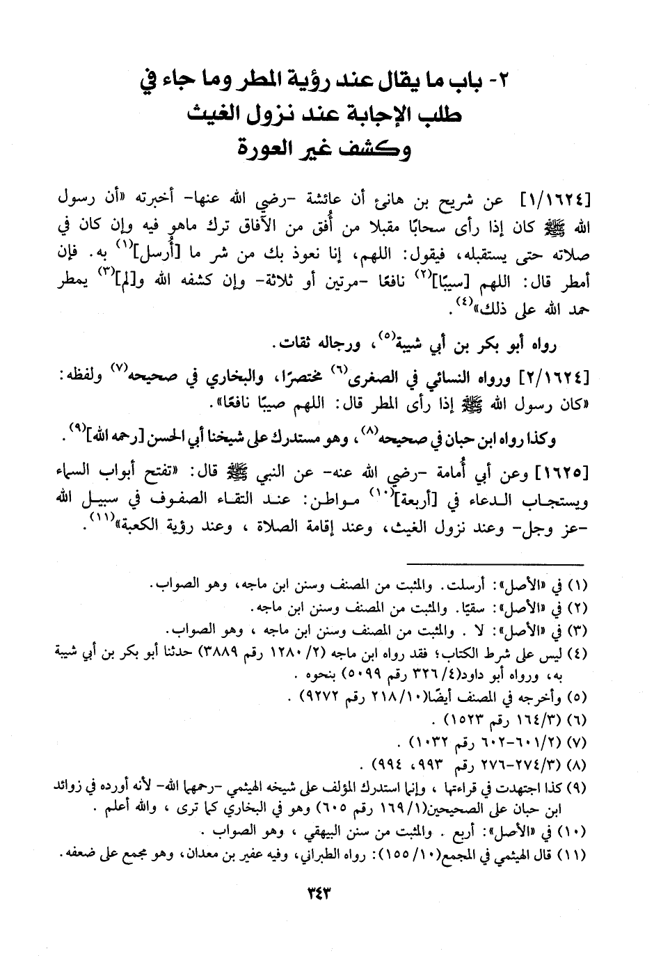 1624 / 2 - وَرَوَاهُ النَّسَائِيُّ فِي الصُّغْرَى مُخْتَصَرًا، وَالْبُخَارِيُّ فِي صَحِيحِهِ وَلَفْظُهُ: "كَانَ رَسُولُ اللَّهِ - صَلَّى اللَّهُ عَلَيْهِ وَسَلَّمَ - إِذَا رَأَى الْمَطَرَ قَالَ: اللَّهُمَّ صَيْبًا نَافِعًا".