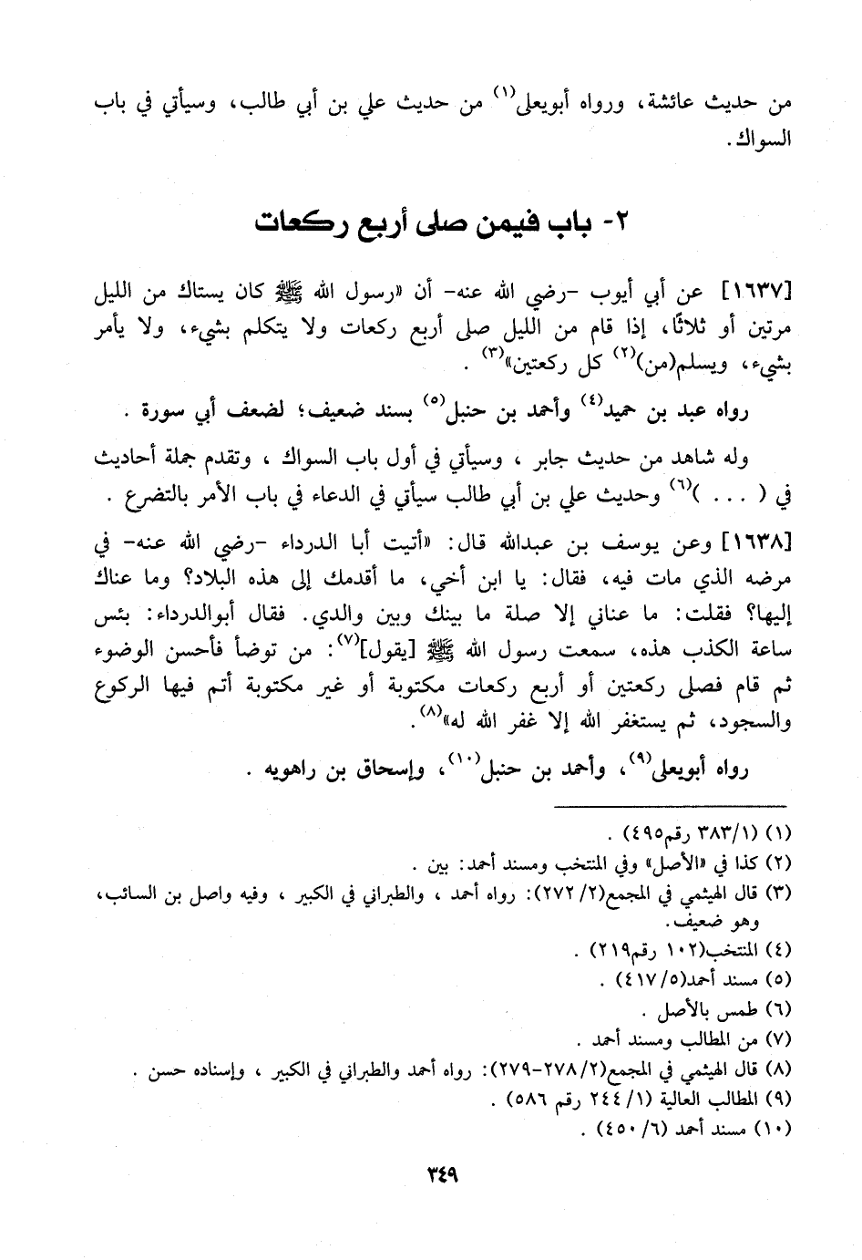 1637 - عَنْ أَبِي أَيُّوبَ- رَضِيَ اللَّهُ عَنْهُ- أَنَّ "رَسُولَ اللَّهِ - صَلَّى اللَّهُ عَلَيْهِ وَسَلَّمَ - كَانَ يَسْتَاكُ مِنَ اللَّيْلِ مَرَّتَيْنِ أَوْ ثَلَاثًا، إِذَا قَامَ مِنَ اللَّيْلِ صَلَّى أَرْبَعَ رَكَعَاتٍ وَلَا يَتَكَلَّمُ بِشَيْءٍ، وَلَا يَأْمُرُ بِشَيْءٍ، وَيُسَلِّمُ مِنْ كُلِّ ركعتين ".
