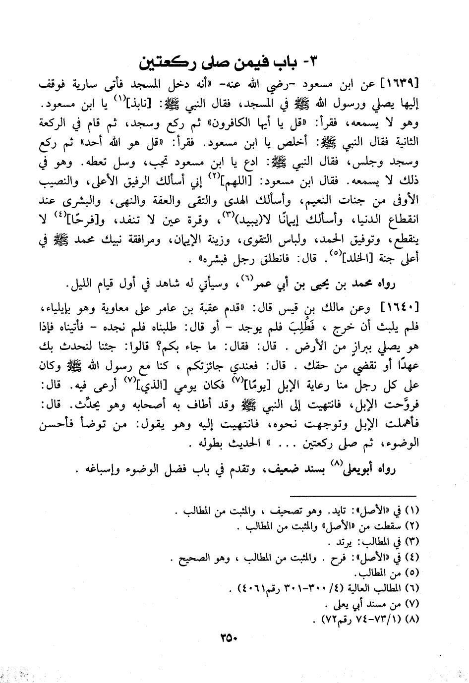 1639 - عَنِ ابْنِ مَسْعُودٍ- رَضِيَ اللَّهُ عَنْهُ- "أَنَّهُ دَخَلَ الْمَسْجِدَ فَأَتَى سَارِيَةً فَوَقَفَ إِلَيْهَا يُصَلِّي وَرَسُولُ اللَّهِ - صَلَّى اللَّهُ عَلَيْهِ وَسَلَّمَ - فِي الْمَسْجِدِ، فَقَالَ النَّبِيُّ - صلى الله عليه وسلم -: نابذ يَا ابْنَ مَسْعُودٍ. وَهُوَ لَا يَسْمَعُهُ، فَقَرَأَ: "قل يا أيها الْكَافِرُونَ " ثُمَّ رَكَعَ وَسَجَدَ، ثُمَّ قَامَ فِي الرَّكْعَةِ الثَّانِيَةِ فَقَالَ النَّبِيُّ - صَلَّى اللَّهُ عَلَيْهِ وَسَلَّمَ -: أَخْلِصْ يَا ابْنَ مَسْعُودٍ. فَقَرَأَ: "قُلْ هُوَ اللَّهُ أَحَدٌ" ثُمَّ رَكَعَ وَسَجَدَ وَجَلَسَ، فَقَالَ النَّبِيُّ - صَلَّى اللَّهُ عَلَيْهِ وَسَلَّمَ -: ادْعُ يَا ابْنَ مَسْعُودٍ تُجَبْ، وَسَلْ تُعْطَهُ. وَهُوَ فِي ذَلِكَ لَا يَسْمَعُهُ. فَقَالَ ابْنُ مَسْعُودٍ: اللهم إِنِّي أَسْأَلُكَ الرَّفِيقَ الْأَعْلَى، وَالنَّصِيبَ الْأَوْفَى مِنْ جَنَّاتِ النَّعِيمِ، وَأَسْأَلُكَ الْهُدَى وَالتُّقَى وَالْعِفَّةَ وَالنُّهَى، وَالْبُشْرَى عِنْدَ انْقِطَاعِ الدُّنْيَا، وَأَسْأَلُكَ إِيمَانًا لَا يَبِيدُ وَقُرَّةَ عَيْنٍ لَا تَنْفَدُ، وَفَرَحًا لَا يَنْقَطِعُ، وَتَوْفِيقَ الْحَمْدِ، وَلِبَاسَ التَّقْوَى، وَزِينَةَ الْإِيمَانِ، وَمُرَافَقَةَ نَبِيِّكَ مُحَمَّدٍ - صَلَّى اللَّهُ عَلَيْهِ وَسَلَّمَ - في أعلى جنة الخلد. قَالَ: فَانْطَلَقَ رَجُلٌ فَبَشَّرَهُ ".