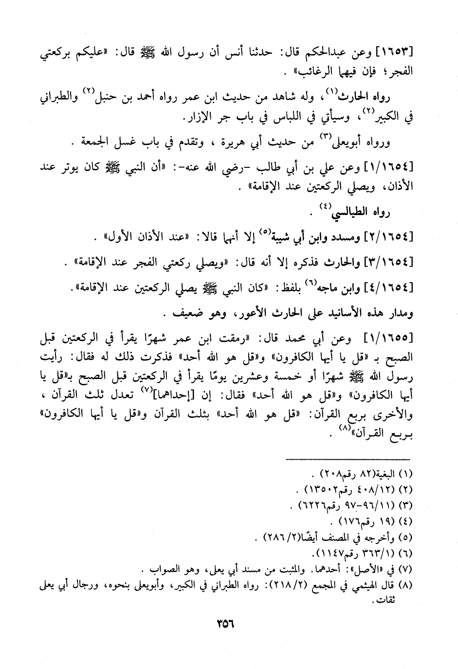 1655 / 1 - وَعَنْ أَبِي مُحَمَّدٍ قَالَ: "رَمَقْتُ ابْنَ عُمَرَ شَهْرًا يَقْرَأُ فِي الرَّكْعَتَيْنِ قَبْلَ الصُّبْحِ بِـ {"قل يا أيها الْكَافِرُونَ} وَ {قُلْ هُوَ اللَّهُ أَحَدٌ} فَذَكَرْتُ ذَلِكَ لَهُ فَقَالَ: رَأَيْتُ رَسُولَ اللَّهِ - صَلَّى اللَّهُ عَلَيْهِ وَسَلَّمَ - شَهْرًا أَوْ خَمْسَةً وَعِشْرِينَ يَوْمًا يَقْرَأُ فِي الرَّكْعَتَيْنِ قَبْلَ الصُّبْحِ بِـ {قل يا أيها الكافرون} و {قل هو الله أحد} فقال: إن إحداهما تَعْدِلُ ثُلُثَ الْقُرْآنِ، وَالْأُخْرَى بِرُبْعِ الْقُرْآنِ: "قُلْ هُوَ اللَّهُ أَحَدٌ" بِثُلُثِ الْقُرْآنِ وَ"قُلْ يا أيها الْكَافِرُونَ " بِرُبْعِ الْقُرْآنِ ".